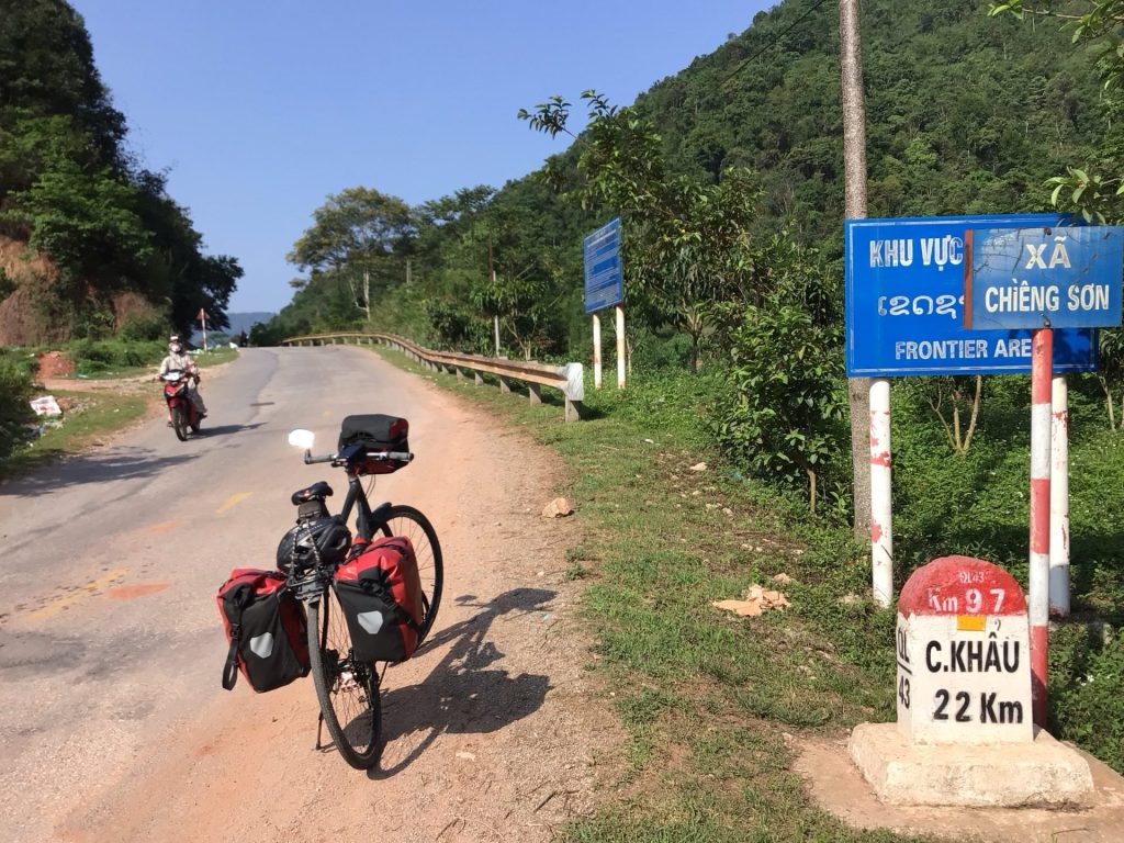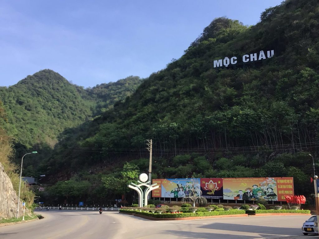 Au coeur de la ville de Môc Châu, je quitte la route principale QL6 pour emprunter la route QL43. La frontière se trouve à 30kms dans la montagne avec 1210 mètres de D+. Après quelques kilomètres à traverser hameaux, plantations fruticoles (fraises, prunes, mangues, …) et zones maraichères, j’entre dans la zone frontalière. Je me dirige vers le poste frontière de C.Khâu à 22kms de ce point.