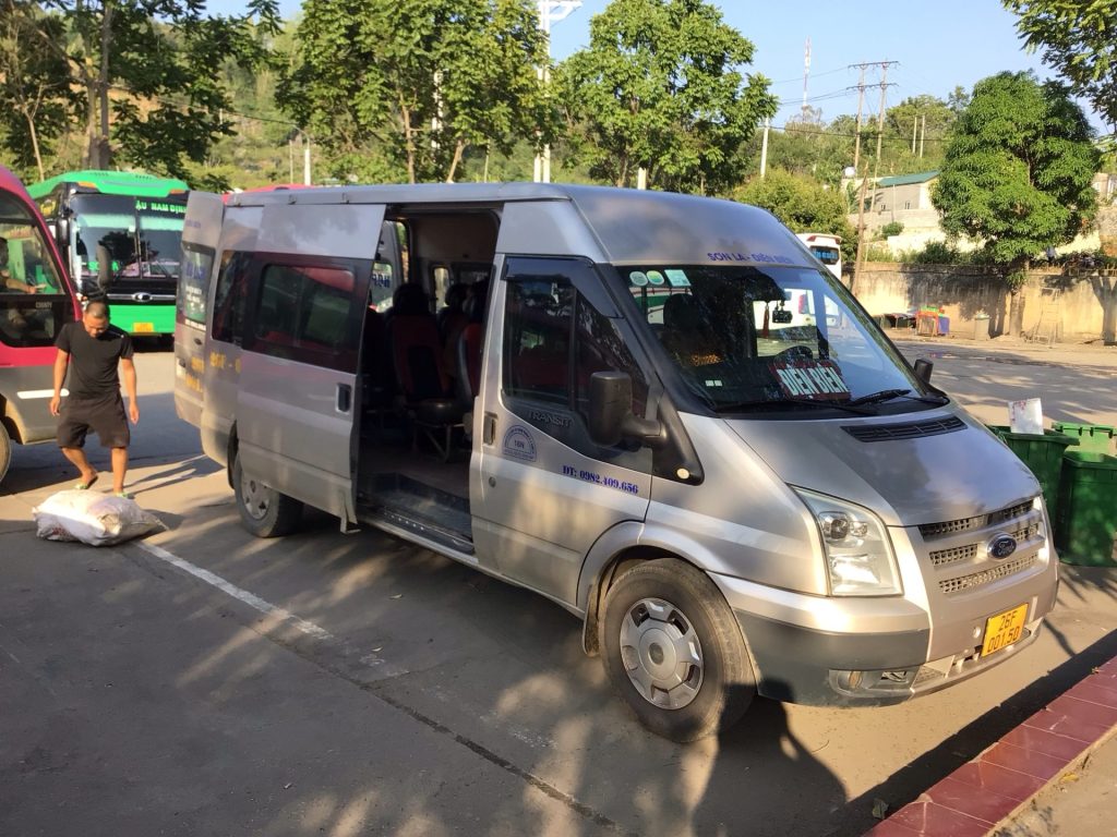 Vers 16h30, mon bus s’arrête dans une station-service à l’entrée de cette grande ville. L’acolyte me demande de descendre. J’obtempère. Un autre minibus m’attend avec une seule jeune femme à bord. Nous nous rendons ensuite à la gare routière pour y récupérer d’autres passagers. Le téléphone arabe fonctionne même jusque dans ces contrées asiatiques. J’ai le temps d’aller faire un tour au Wi Sih, boire un cá phê sua da (café au lait sucré glacé …en sachet hélas), m’acheter une nouvelle bouteille d’eau fraiche et commencer à rédiger ces lignes. A 18h00, nous quittons Son La. Nous sommes 6 à bord de ce minibus.