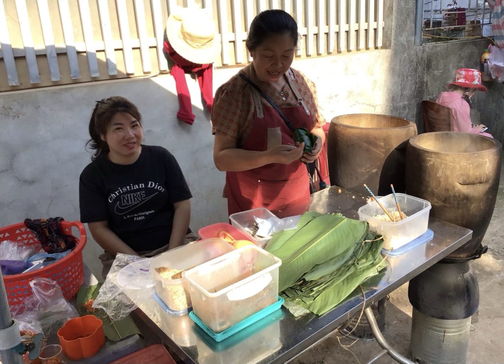 Je passe devant des écoles. J’essaie de repérer une de ces marchantes ambulantes qui vendent du riz gluant sucré avec des arachides. Bingo ! J’en trouve une avec sa fille qui assure la caisse. Tout est savamment disposé, avec les deux chaudrons sur le côté et tous les ingrédients devant, pour être le plus rapide et le plus efficace possible quand les jeunes arrivent. Quant à moi, je prends mon sachet et vais m’installer un peu plus loin sur une placette pour déjeuner tranquillement.