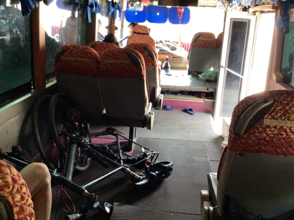 Après ce plantureux repas, je dois maintenant trouver un bus qui me ramène au nord-ouest. Je retrouve la route principale QL6 et retourne à mon point de départ de ce matin. Mais j’aimerais avoir confirmation que les bus partent bien de là. Je m’arrête à 2 ou 3 reprises pour finalement tomber sur une tablée de jeunes adultes en train de boire le thé et fumer le calumet de la paix. Via mon traducteur, je leur demande où se trouve la station de bus. Le plus déluré de la bande me répond que c’est ici ! Je ne comprends pas. Il m’explique que, en fait, à partir les terminus, il n’y a pas d’arrêt. Les gens font signe au bus en fonction des destinations et des couleurs de bus. Lui attend le bus-couchette pour aller à Diên Biên Phu justement. Sa compagne tient cette gargote où j’aurais mieux de déjeuner. Il passe un coup de fil et me dit qu’un bus sans couchette va bientôt passer. Il a prévenu le chauffeur de s’arrêter. Trop sympa. Quelques minutes plus tard, ce bus arrive. Je démonte Haka2 et nous grimpons à l’intérieur. Il y a effectivement de la place pour mettre des bagages. D’ailleurs, en cours de route, lui et son acolyte vont charger une dizaine de cartons tout droit sortis d’un camion. Par contre, ce bus ne dessert que Son La plus au nord.
