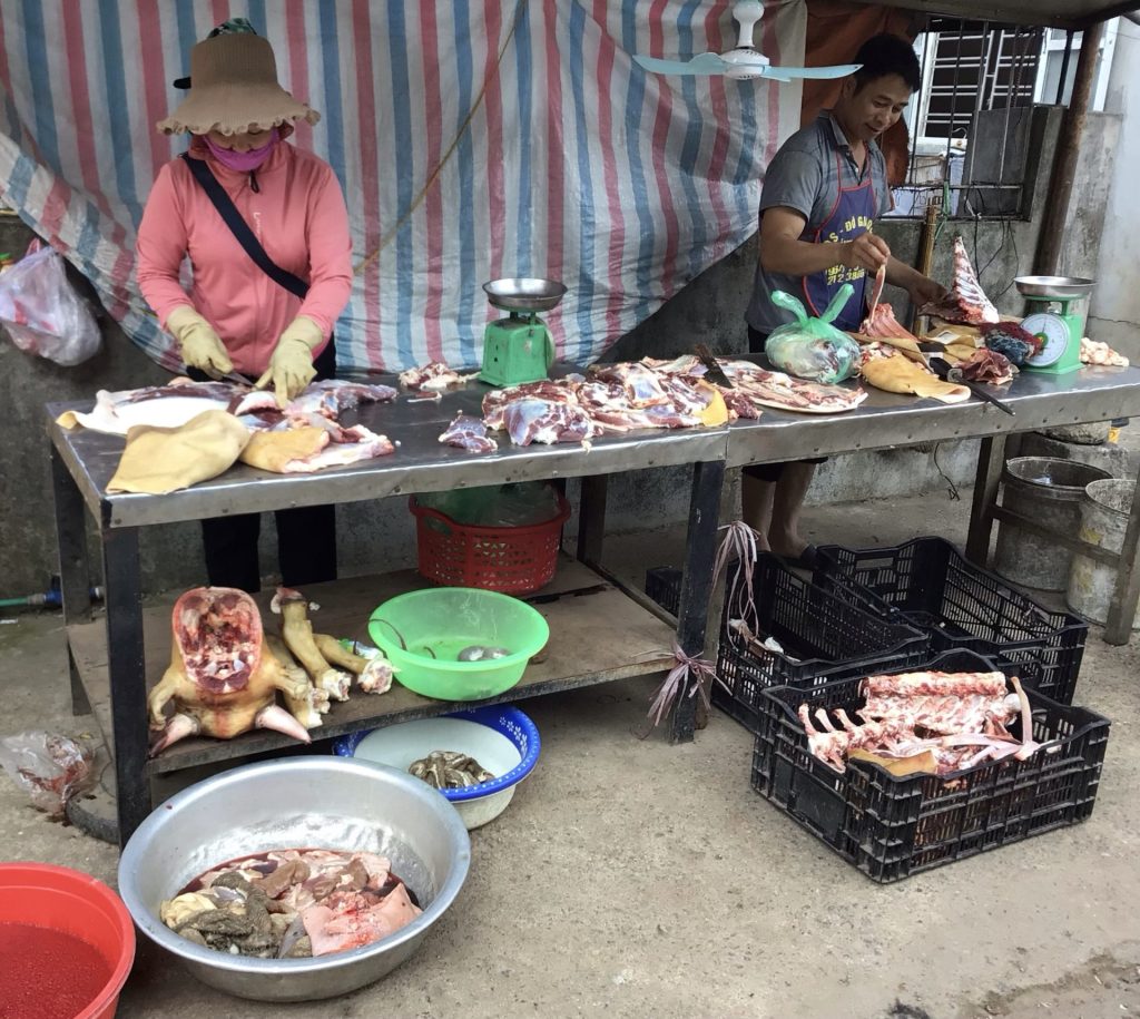 Juste à côté de ce stand, se tient celui du boucher. Là, c’est vraiment en circuit court du producteur au consommateur. La bête est découpée sur place. La tête du bestiau en est d’ailleurs toute retournée (en bas à gauche). Dans la bassine de fer, la tripaille attend d’être nettoyée. Les autres pièces sont découpées par madame et monsieur. En guise de p’tit déj’, il faudrait que j’essaie un de ces 4.