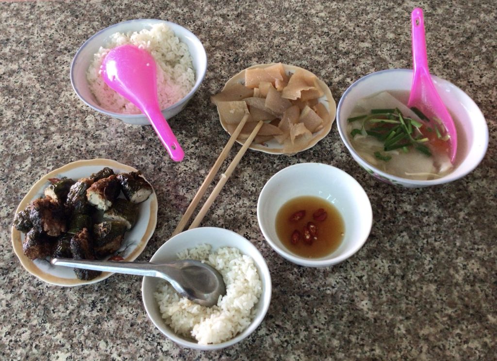 La descente se fait beaucoup plus rapidement que la montée. A part une petite frayeur en sortant un peu large d’un virage, je suis de retour à Môc Châu peu après midi. Je m’arrête dans un restau alors que j’arrive en ville. Une fois de plus, le repas est copieux. J’ai choisi ces petites saucisses très parfumées que j’avais découvert au restau routier hier ainsi qu’une coupelle de lamelles de bambous macérés (je pense). Par contre, l’addition est salée (100.000VND). Même un couple vietnamien, arrivé en même temps que moi, se plaint de la note un peu trop élevée à leur goût. Quant à moi, j’ai à nouveau rempli un pochon pour mon diner.