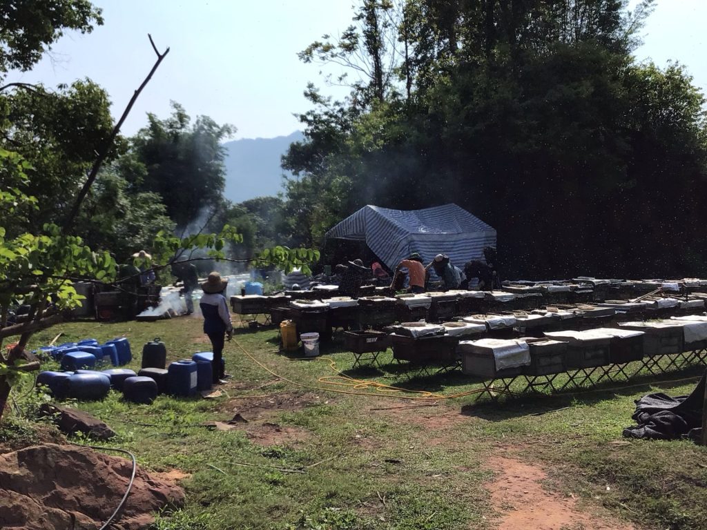 Je passe devant des rûches. La jeune fille à l’entrée se tient prête à intervenir avec son tuyau d’arrosage. On ne le voit pas bien sur la photo mais ça bourdonne sacrément au-dessus des ruches alors que les grilles sont sorties pour extraire le miel.