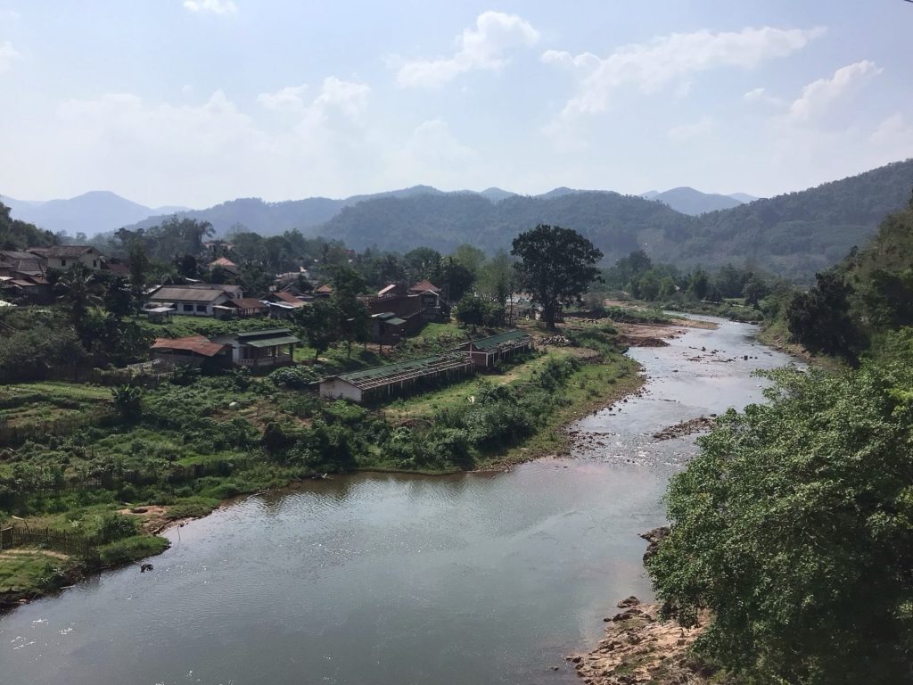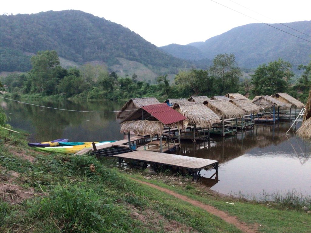 Je me rends au second en bord de rivière à la sortie du village. Je tombe sur un jeune patron bedonnant et souriant. Après bien des palabres inutiles, il me propose un lit à 250.000KIP soit 2 fois plus cher que d’habitude. Je refuse et lui en propose 150 comme d’hab’. Il appelle sa femme, parlemente, consulte son téléphone, regarde son ordinateur et n’ose pas me dire que ce n’est pas assez. Je lui en propose alors 200 en lui disant que j’allais consommer chez lui, que j’étais exténué et que je voulais dormir. Il me dit que je peux trouver un hébergement ailleurs à 150. Vraiment bizarre. Je me rends au Muang La Lodge GuestHouse. Là, c’est un problème d’eau. Donc pas d’eau, pas de chambre. La patronne m’en indique un autre pas très loin et également sur ma carte. Il s’agit du Muang La Hotel. Même problème que précédemment. La jeune patronne parlant un peu anglais, m’explique que le niveau de la rivière est trop bas et que l’eau ne remonte plus. Je n’ai plus qu’à retourner voir mon drôle de zigue. Je conclus l’affaire à 200. Et il me conduit enfin à ma chambre … qui se trouve être en fait une habitation en forme de fruit. Il y en a trois comme cela. Je comprends maintenant pourquoi le prix et pourquoi sa réticence à le baisser. C’est hyper kitsch mais aménagé sobrement à l’intérieur. J’adore. De plus, l’endroit est calme et superbe. De petits bungalows sont installés sur l’eau pour que les clients puissent y déjeuner. Quant à moi, je passe la fin de l’après-midi et le diner à la terrasse du restaurant donnant sur cette vue.