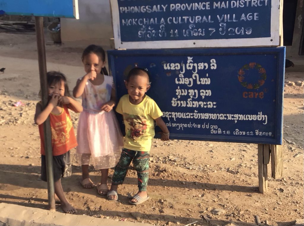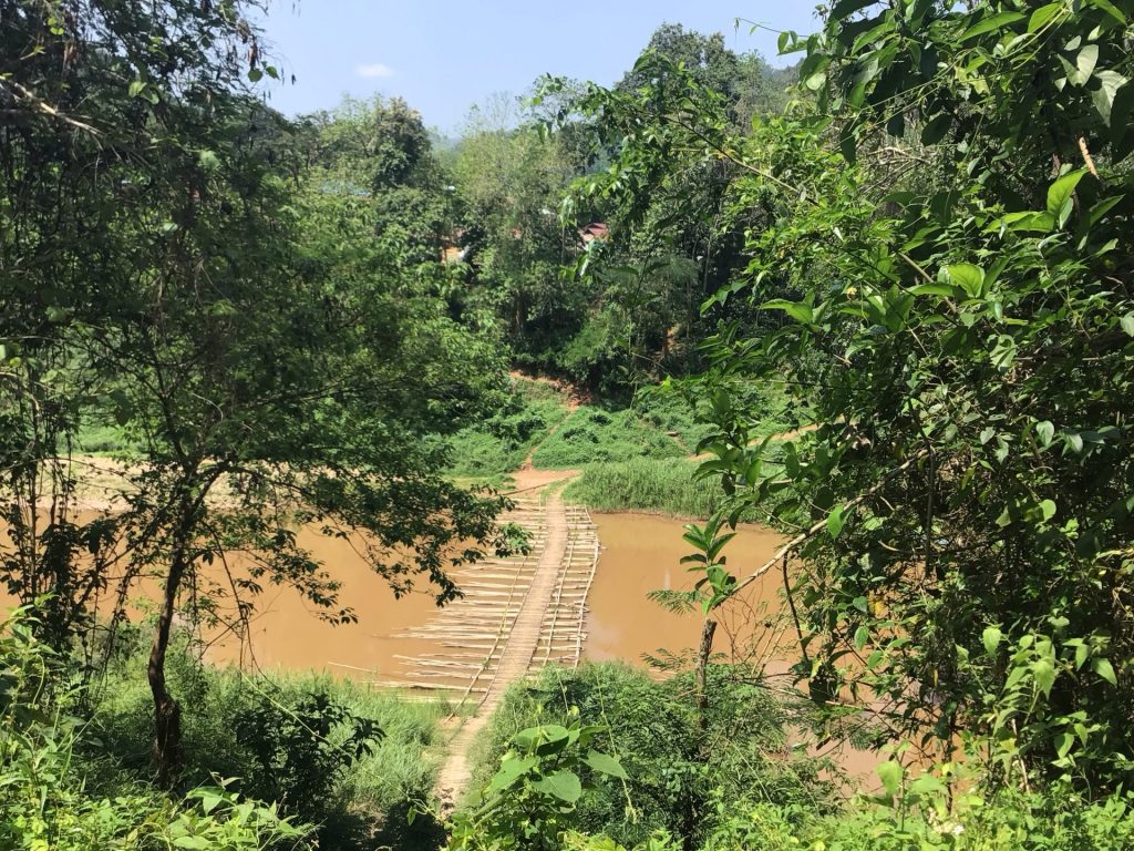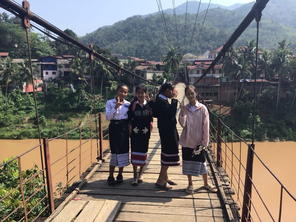 Cette partie est très agréable. Je suis souvent à l’ombre, protégé par les arbres de la forêt sur ma droite. De plus, le vent rentre dans la vallée et m’aère les bronches. Enfin, la route est une succession de petites montées et descentes qui épousent les courbes de la rivière. J’alterne moyenne et grosse plaque et je monte et descends les pignons en fonction de la déclivité. C’est un joli cliquetis rythmé aussi par les chansons d’Alain Bashung. J’arrive dans le village de Mang Khoua où la Nam Phak River se jette dans la Ou River. J’emprunte à pied la passerelle qui enjambe la première nommée. J’y croise un quatuor de jeunes collégiennes. Je leur demande de poser pour moi. Une d’elles est plus réservée que les autres.