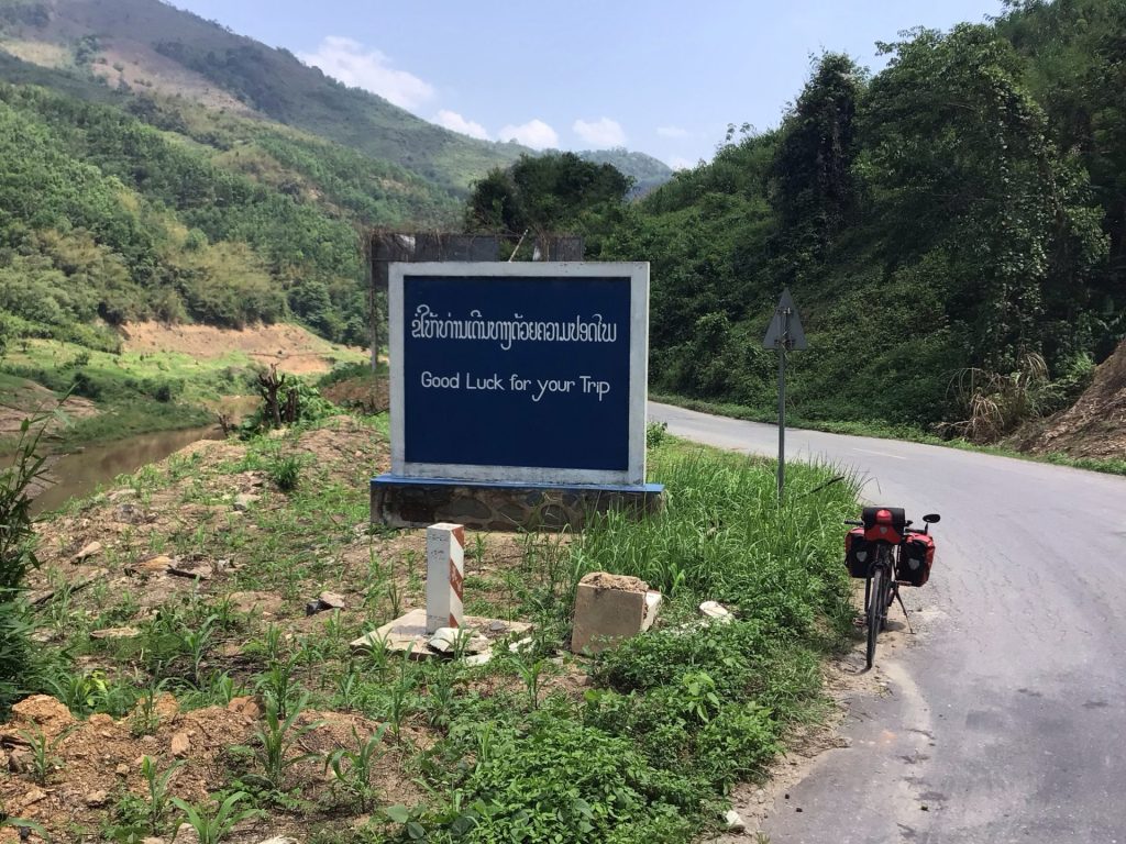 Après cet épisode insolite, je me dirige après le pont vers l’un des deux GuestHouse de cette bourgade. Je m’enquiers auprès du restaurateur de la localisation de cette maison d’hôte. Elle se trouve juste en face. Un homme un plus âgé que moi m’interpelle alors en français. Il me dit qu’il m’a doublé en voiture sur la route et me demande ce que je fais dans ces contrées perdues à vélo. Quant à lui, il est médecin à la retraite et bénévole dans l’association « Peuples et Montagnes du Mékong ». Il est en mission, avec son président et une femme franco-vietnamienne, dans ces villages montagnards. Je le laisse déjeuner puis traverse la route pour réserver une chambre. Mais le réceptionniste me dit en anglais que c’est « Full ». Donc complet pour les non-anglophones. C’est bien la première fois que cela m’arrive. Je me rends au second juste avant le pont. La gérante me jette en laotien sans que je comprenne pourquoi. Je reviens au restaurant, retrouve mes français attablés et demande l’assistance de la femme interprète. Finalement, le second est complet aussi. Ça se complique. Je viens de faire 74 kms avec du dénivelé, la chaleur grimpe, la fatigue s’accumule. Je me serais bien posé. Finalement, je me pose pour déjeuner alors que le trio associatif retournent à Luang Prabang. Je n’ai d’autres choix que de descendre jusqu’à Muang La sis à 37 kms d’ici. La sieste sera pour demain ! Et même les panneaux se montrent ironiques …