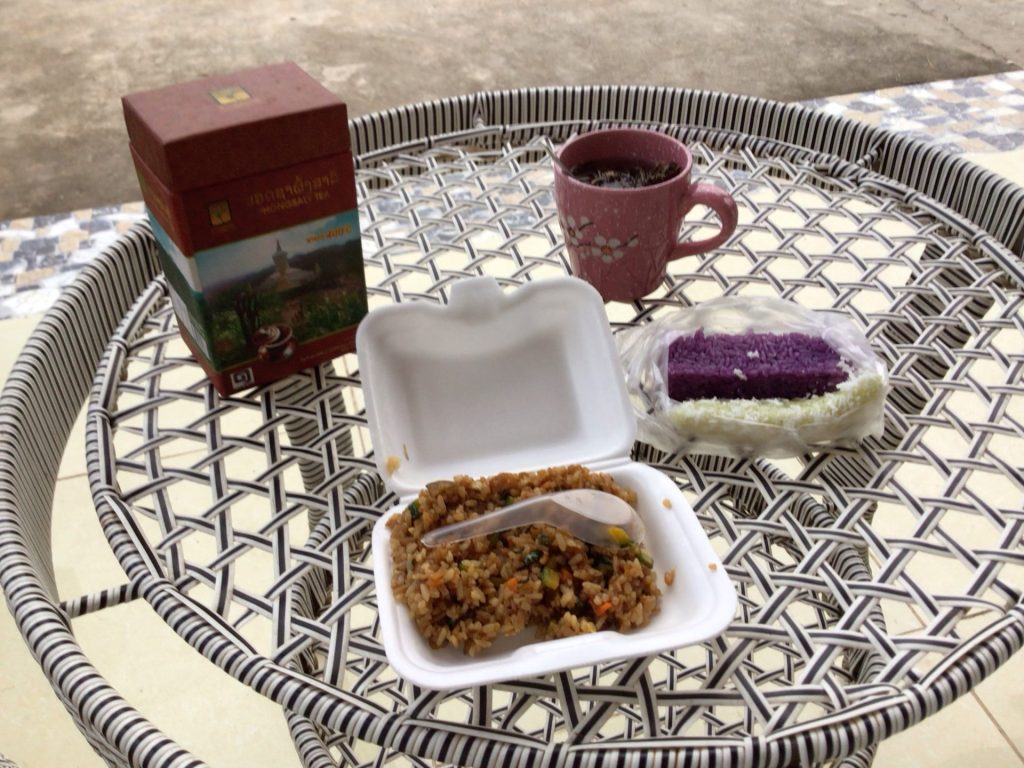 Une fois mes courses effectuées, je retourne à mon GuestHouse pour y déjeuner tranquillement. D’autant plus qu’un délicieux thé de ce district de Phongsaly est gracieusement mis à disposition. J’ai donc opté pour une salade de riz et deux gâteaux de riz sucrés et parfumés. Avec ça dans le coffre, je devrais avoir assez de glucides pour tenir un petit moment.