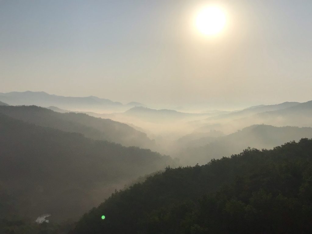 Je grimpe à travers ce paysage pendant 16 kms avec 1200 D+ et 500 D- (donc quelques grosses descentes). J’arrive à plus de 1.000 mètres d’altitude. Une fois au sommet, la vue est absolument sublime sur les monts embrumés alors que le soleil continue lui aussi son ascension journalière. D’ailleurs, je ne regrette pas mon choix d’avoir posé les sacoches hier à midi. Cela aurait été pure folie d’attaquer ce col en plein cagnard. Déjà qu’avec la fraîcheur matinale, c’est chaud patate; avec la chaleur journalière, c’eût été torride frite.