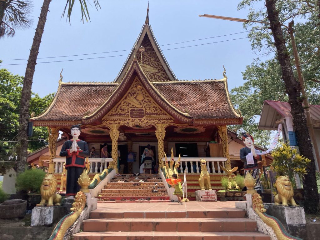 Elle donne sur la rivière qui se trouve devant mon palier. Devant, des bungalows peuvent accueillir des clients qui viennent déjeuner. Mais ce sont surtout ceux les pieds dans l’eau qui sont privilégiés. Sur la droite au loin, j’aperçois le temple bouddhiste du village. Cela faisait un moment que je n’en avais plus vu.