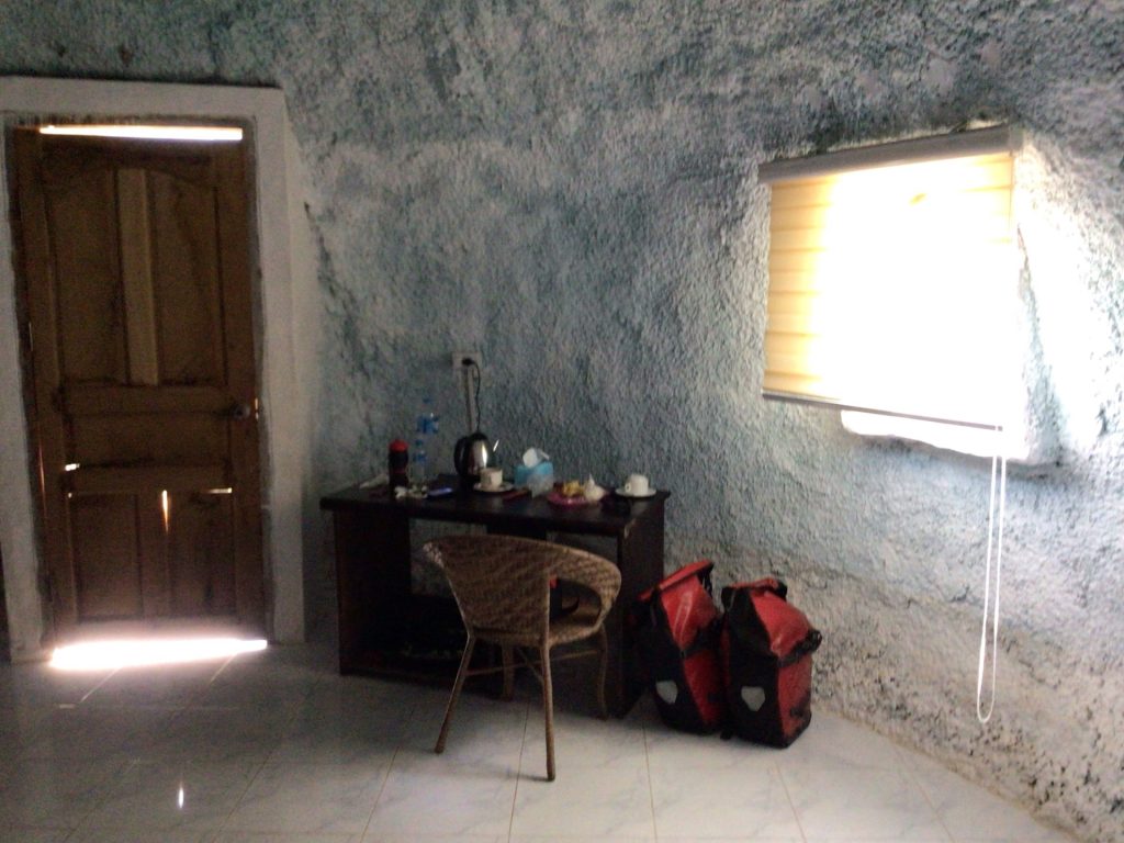 Comme tous les matins depuis un bon moment maintenant, je suis réveillé au lever du soleil. Mais, comme quand j’étais plus jeune et faisais mon réveil le dimanche matin pour avoir le plaisir de me rendormir, je n’ai pas à me lever. Je peux me rendormir en toute tranquillité. Pas de p’tit déj’ à improviser, pas de sacoche à boucler, pas de Haka2 à charger, pas de pneu à regonfler, pas de route à tracer. REPOS !!! J’émerge à nouveau vers 7h30. Je me dirige vers la terrasse. Le patron émerge à peine également. Je lui commande une papaya salade, notre p’tit’ déj’ préféré avec Nico en Thaïlande, accompagné d’une portion de riz.