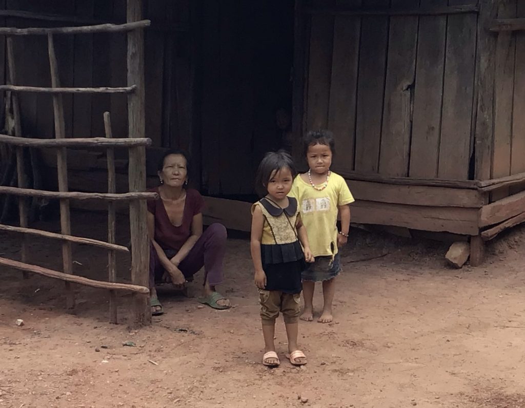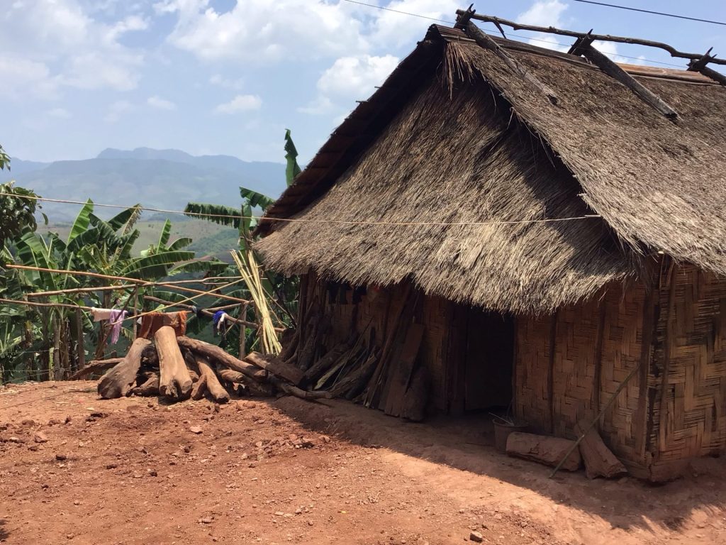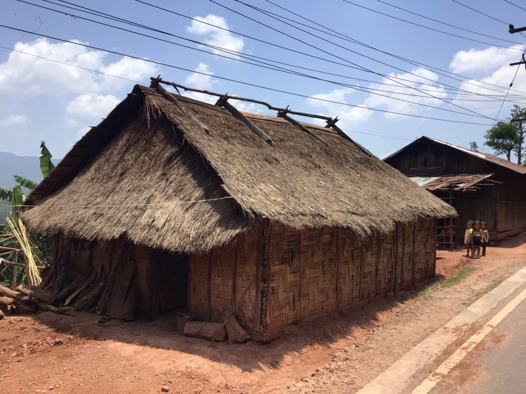 J’approche du but. Les monts deviennent plus doux. Par contre, ils sont toujours aussi ratiboisés. Au loin, les montagnes d’où je viens sont beaucoup plus impressionnantes. Je traverse maintenant le village de B.Lak44. Cette fois-ci, mon regard est attiré par cette belle cabane au toit de chaume et aux parois d’osier avec ce faîtage de bois. Des gamines me scrutent depuis la maison d’à côté.