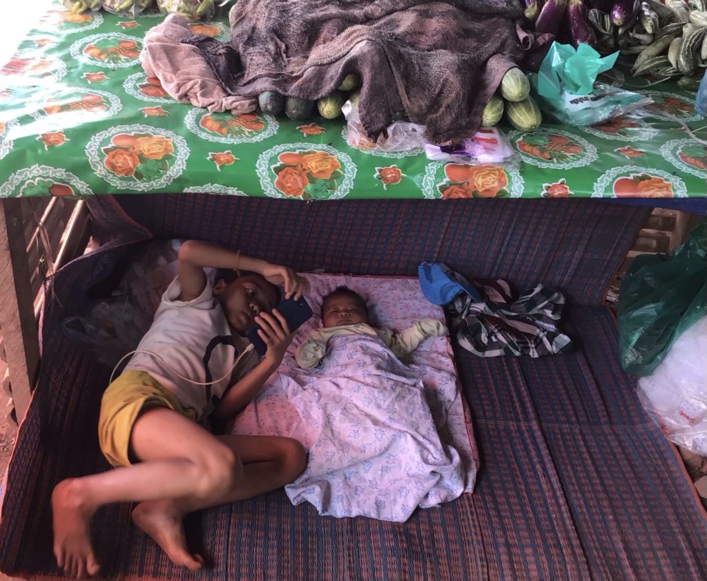 Un peu plus loin, je découvre les enfants d’une vendeuse installés sous le stand. Evidemment, la grande est sur son portable pendant que son frangin roupille.