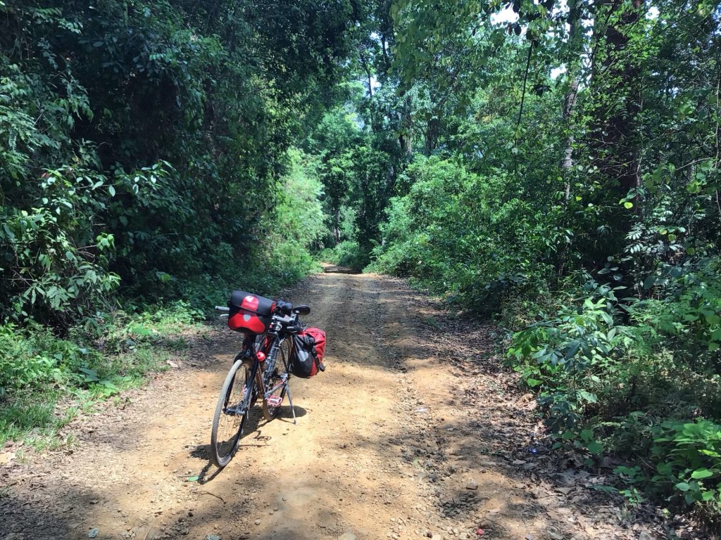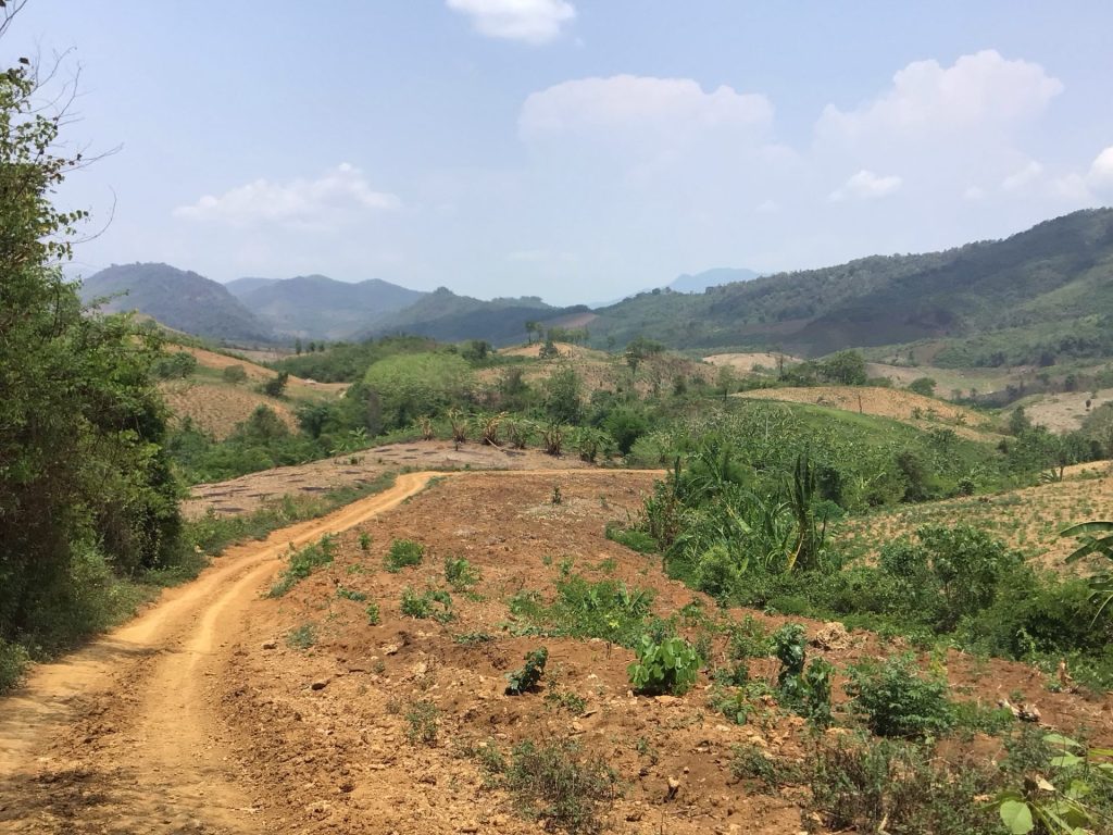 Je croise ensuite quelques scooters venant peut-être prêter main forte. Mais la piste continue de grimper. A chaque virage, je pense arriver sur une route bitumée pour « Vélo de route » selon Mapy.cz. J’emprunte maintenant une piste en latérite. Je croise quelques paysan.nes, machette à la main, sur ce chemin.