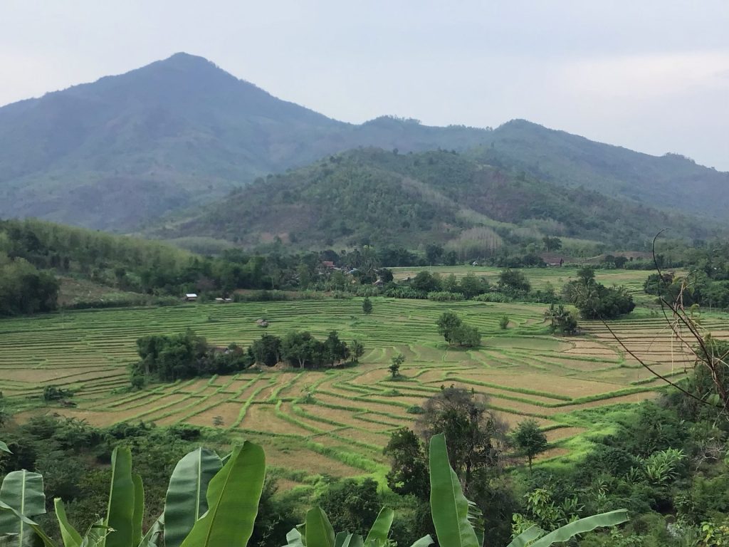 Dans les vallons, les rizières prennent des formes géométriques surprenantes. Cela me change des paysages désertiques traversés depuis ce matin.