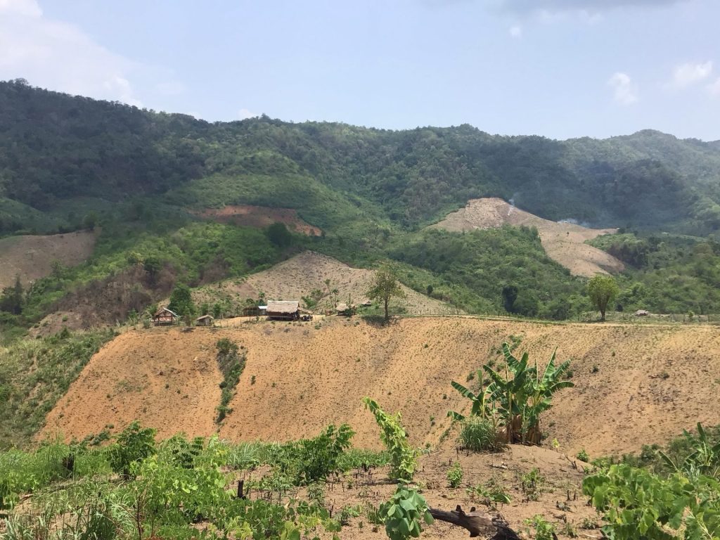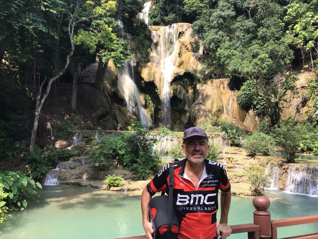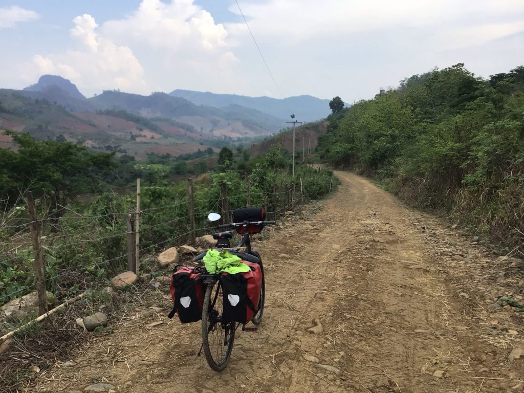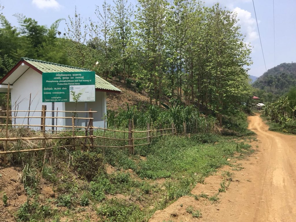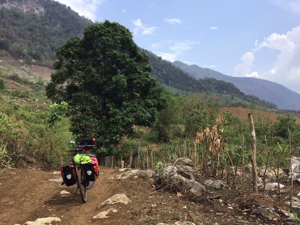 A 10h30, je retrouve Haka2 qui m’attend sagement sur le parking. S’il savait ce qui l’attend, il se serait barré le pauvre. Pour rejoindre la ville de Chang Nan un peu plus sud, mes traceurs, positionnés sur « Vélo de Route » me proposent 3 options. Une première de 48 kms et 1100D+ par la route dans les montagnes. Une seconde de 55 kms et 770D+ qui longe le Mékong en empruntant une piste.. Une troisième qui me fait revenir à Luang Prabang pour emprunter une autre vallée donc 98 kms et 2254D+. J’opte pour la première option. Je reprends donc la route qui me ramène à Thapene. A l’entrée du village, je dois bifurquer à gauche, la route principale menant au parking des cascades donc dans un cul-de-sac.