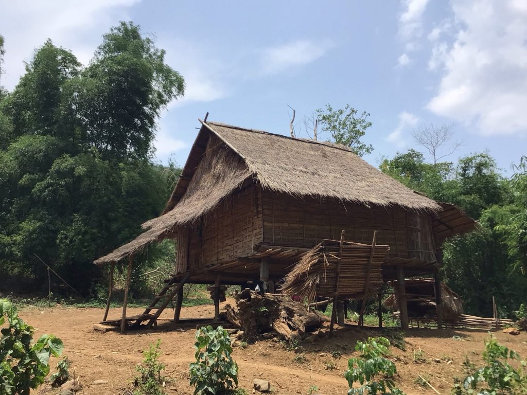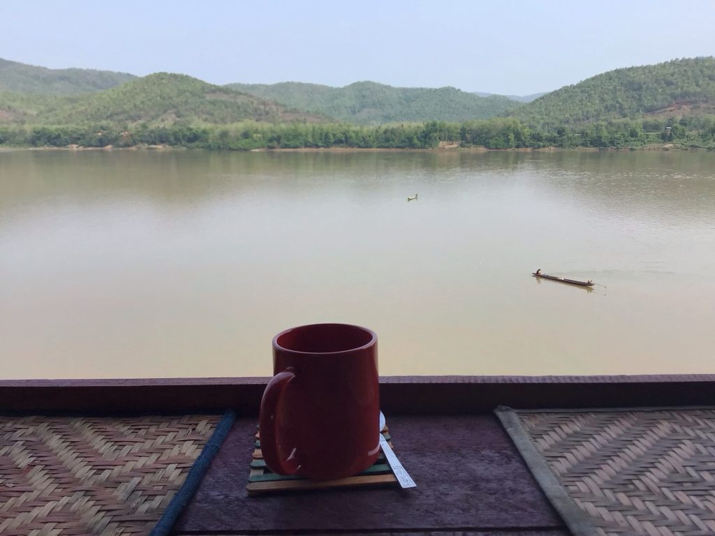J’emprunte la petite route qui longe le Mékong. J’ai trente kms à parcourir et 600 D+ quand même pour me rendre sur le site des chutes. A scooter, cela peut paraître plat (n’est-ce pas Loïc) mais, à vélo musculaire, il y a une belle colline à franchir. Peu après, je m’arrête en bord du Mékong pour y déguster un vrai café. D’ailleurs, il y a quelques plantations dans le coin. Une d’elles propose même du café à la civette, équivalent au café Luwak de Bali.