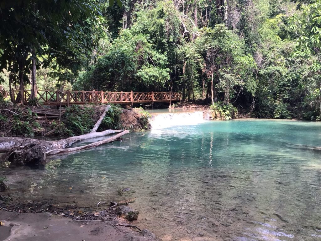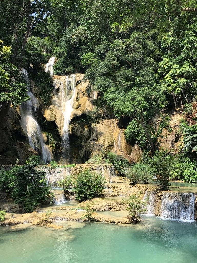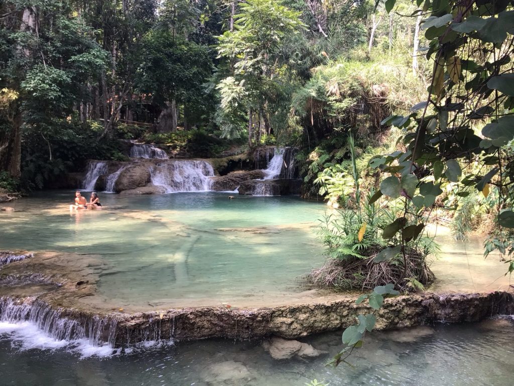 Hier soir, c’était le coq laotien qui m’a réveillé à 4h du mat’. Ce matin, c’est le cochon chinois qui m’a tiré du sommeil à 3h du mat’. Les 3 chinois, occupant la chambrée, n’ont pas été particulièrement respectueux de ma présence hier soir (discussion à voix haute, portable avec le son ouvert, lumière allumée jusqu’à 23h, …). De mon côté, ils ont pu profiter en direct-live de la montée du dernier col de l’étape du Giro. Mais cette nuit, ce fût le pompon. Le plus grassouillet des trois s’est mis à ronfler en imitant le cochon. Comme j’ai épuisé mon stock de boules Quiès, je me suis mis à bouquiner en attendant que le cochon se calme. Autant dire que ce matin, je me lève plus tard que d’habitude. Mais c’était aussi voulu. A 7h00, après avoir avalé 2 petites bananes en guise de p’tit déj’, j’ai la patate pour me rendre aux fameuses cascades de Kuang Si.