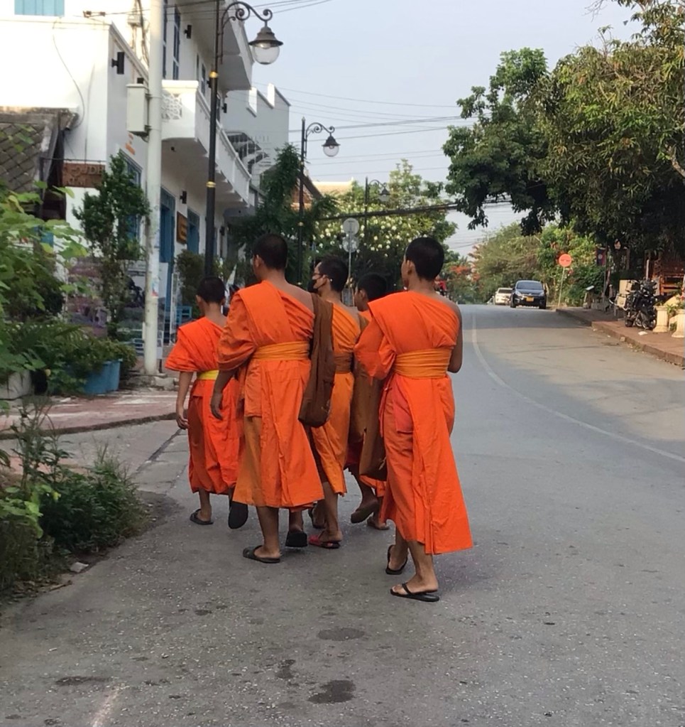 Auparavant, je m’arrête devant une gargote pour m’acheter une belle dose de riz et une pochette surprise enveloppée sous des feuilles de bananier. Je vais m’installer en bord de Mékong pour avaler ce p’tit déj’ roboratif. La surprise est composée d’une pousse de bambou farcie. Avec le riz, c’est parfait. Et que j’ai bien fait d’avaler ce copieux repas. Quand je reprend ma route, je double des moines bouddhistes en train de faire leur quête quotidienne.
