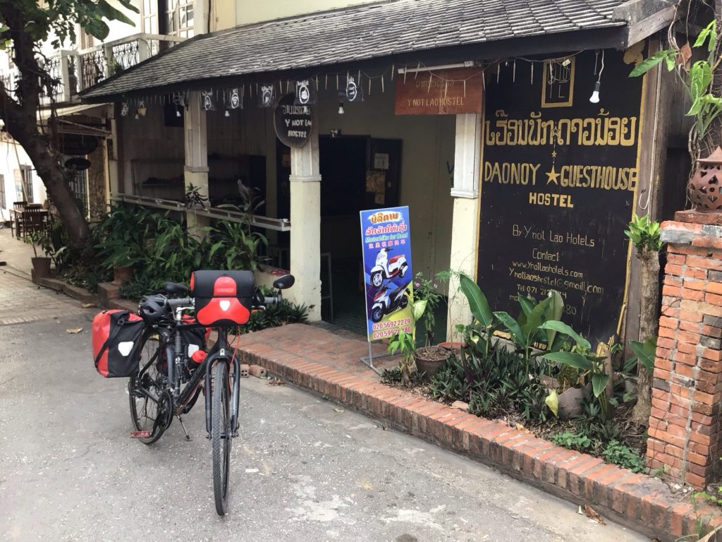 Je rejoins enfin la route bitumée n° 4 par laquelle j’aurais pu arriver en prenant l’option 3. L’hébergement repéré est bien là. Il n’est pas complet. De plus, il est nickel avec ses boiseries posées sur du plâtre blanc. Tout fonctionne : clim, ventilo, douche, robinet, Wifi. Après cette étape interminable, c’est le grand luxe ! La patronne est en plus charmante. Je peux enfin me doucher, laver mes fringues et Haka2, puis déguster un ananas coupé devant moi. Vers 18h30, je migre au restau en face pour engloutir une belle assiette de riz frit accompagnée d’une Heineken (pas de Beerlao !) gouleyante. Il est temps de rentrer me reposer après, je pense, une de mes plus rudes journées à vélo-rando. J’ai mis environ 6h00 pour faire 48 bornes soit du 8km/h.