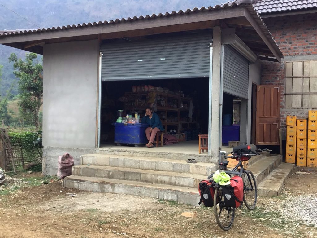 Par contre, la pluie a rendu la terre collante. Je suis obligé d’enlever le garde-boue avant. L’arrière est fixé. Je ne peux l’enlever. La boue s’agglutine dessous. Je le nettoie avec un bâton. Si ça continue ainsi, je vais passer la nuit dans la montagne. Je repars. Le ciel se dégage. Le soleil revient. La chaleur également. La route sèche. J’entame la descente. Je fais gaffe de ne pas me casser la gueule dans les ornières. Vers 14h30, j’arrive à un second village toujours pas répertorié sur mes cartes. A défaut d’une gargote pour manger, je trouve enfin une boutique ouverte.
