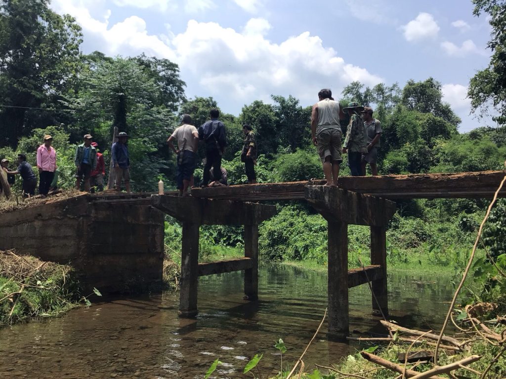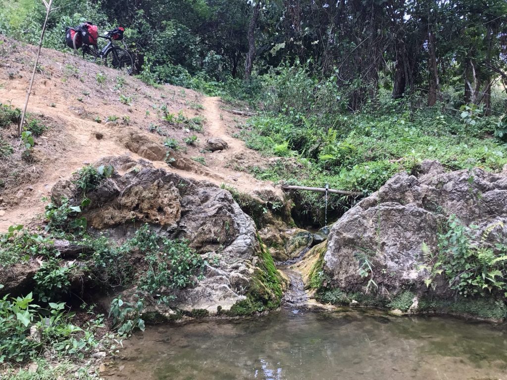 Il est 10h30. J’attaque donc par une piste hyper pentue qui monte au-dessus de la cascade. Je ne l’aurais pas fait à pied mais à vélo. Je pense que cette piste va m’amener sur une route au-dessus du village. D’ailleurs, un peu plus haut, je tombe sur des villageois en train de réparer la passerelle qui enjambe le torrent au-dessus des cascades.