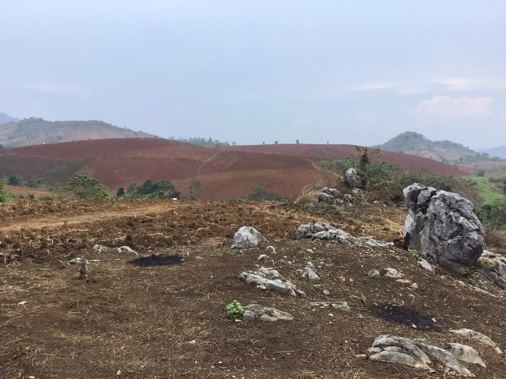 C’est quand bizarre cette affaire. Je continue de descendre vers le sud mais sans trouver cette route espérée. Vu les kms déjà effectués, je ne me vois pas non plus rebrousser chemin. Je continue. Le paysage s’ouvre maintenant sur des collines complètement ratiboisées.