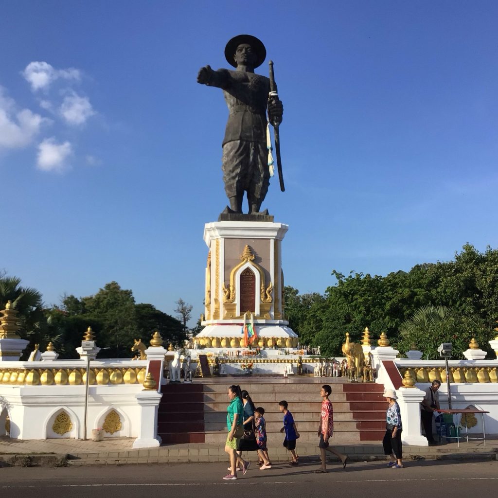 Ensuite je vais me boire un bon café dans un vrai café. J’en profite pour choper la wifi, repérer les endroits à visiter et trouver un hébergement bon marché. Je m’y rends. Il se nomme « TT Hostel » mais c’est, en fait, une petite auberge de jeunesse récente … tenue par un couple de vieux français. Après avoir acheté un repas dans un stand, je déjeune et sieste à l’hôtel. En milieu d’après-midi, je pars me balader en ville. Il fait une chaleur étouffante. Je vais à pied jusqu’au Chao Anouvong Park, un grand parc tout en longueur, ceinturé par 2 boulevards, parallèle au Mékong. La statue de Chao Anouvong (1767-1829) fait face au Palais Présidentiel. Ce fût le dernier roi du LAO Kingdom of Vientiane.