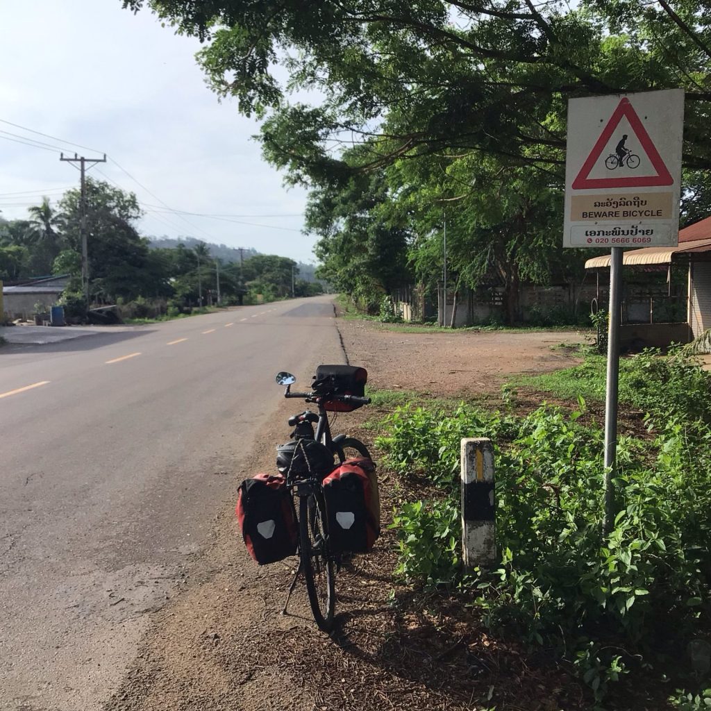 Je traverse quelques villages mais sans m’arrêter. En effet, j’ai déjà déjeuné avant de partir. Hier soir, en guise de dîner, j’ai acheté des brochettes avec du riz gluant. Et le jeune couple qui m’a servi n’y a pas été de main morte. En plus d’une brochette offerte, ils m’ont servi une sacré dose de riz. En guide de dessert, j’avais acheté un sachet de Chocapic thaï. Et ce matin donc, j’ai fini le riz avec mes croquettes chocolatées. Cela change de la soupe. Je poursuis ma route encore relativement calme alors que ce panneau m’interpelle. C’est la 1ère fois que je le vois alors que je vais quitter le Laos.