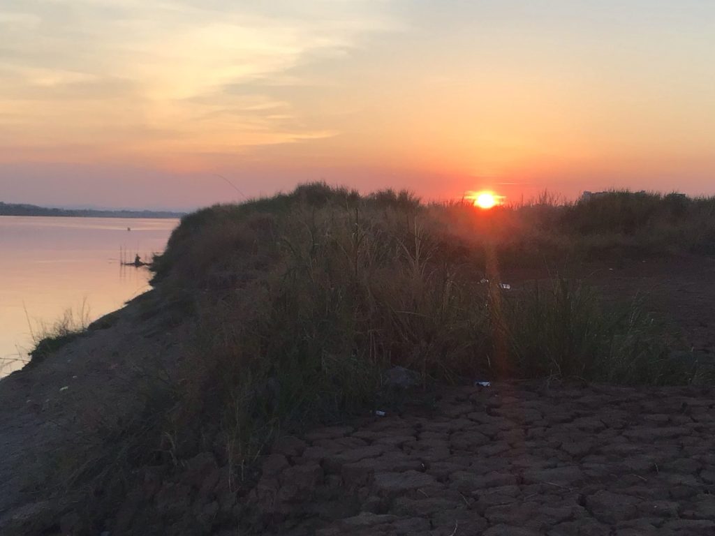 Dans ce parc, se tient également un énorme marché de nuit. Je le traverse alors que les marchands du temple installent leurs stands. Pour amener leur camelote, la plupart des vendeurs conduisent de vieilles pétrolettes puantes et pétaradantes. De plus, ce ne sont que des stands de fringues, montres, lunettes, … de contrefaçon. Toutes les grandes marques occidentales (Versace, YSL, Dior, Vuitton, Nike, … etc …) y sont présentes. C’est à l’image de cette ville : complètement anachronique. De nouveaux bâtiments sont construits au milieu de vieux quartiers délabrés. Je dîne dans le marché alimentaire avant d’aller admirer le coucher de soleil sur le Mékong … et la grande friche au pied de la ville !