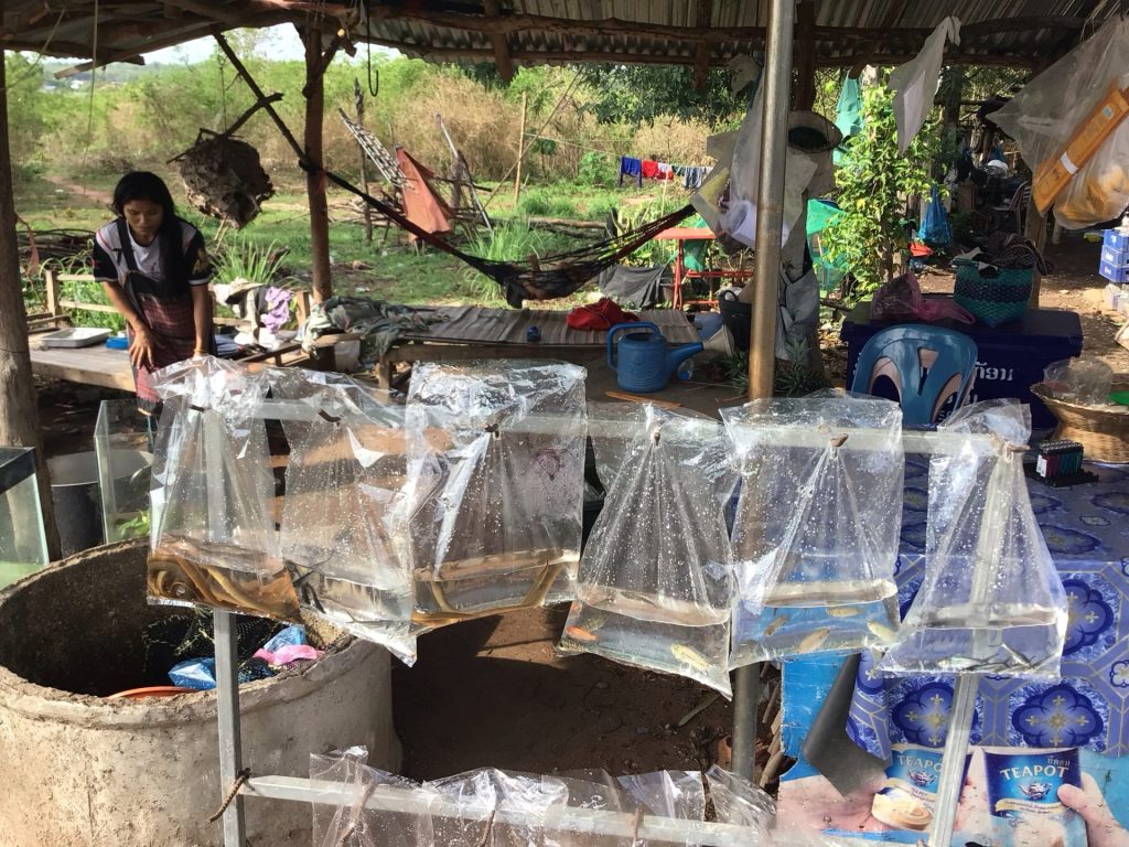 Après une pause café en cannette, je poursuis ma route à bonne allure malgré son état à nouveau chaotique avec pas mal de trous remplis d’eau. C’est quand même étonnant alors que la capitale se rapproche et que la circulation devient un peu plus dense. Ce n’est pas non plus la rocade toulousaine aux heures de pointe … Un stand attire à nouveau mon attention. Dans des sachets en plastique suspendus, des serpents ou couleuvres et d’autres poissons tournicotent en rond. Est-ce pour les manger ou pour décorer dans un aquarium, je ne le saurais pas malgré ma demande (et mimes) à la jeune femme.