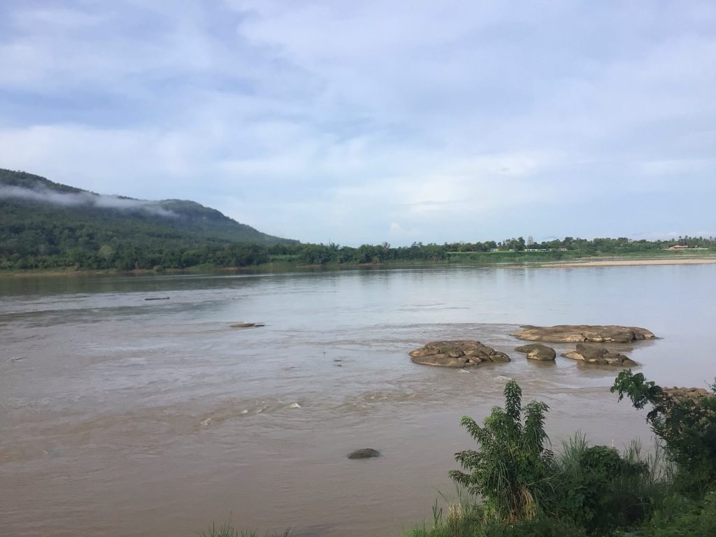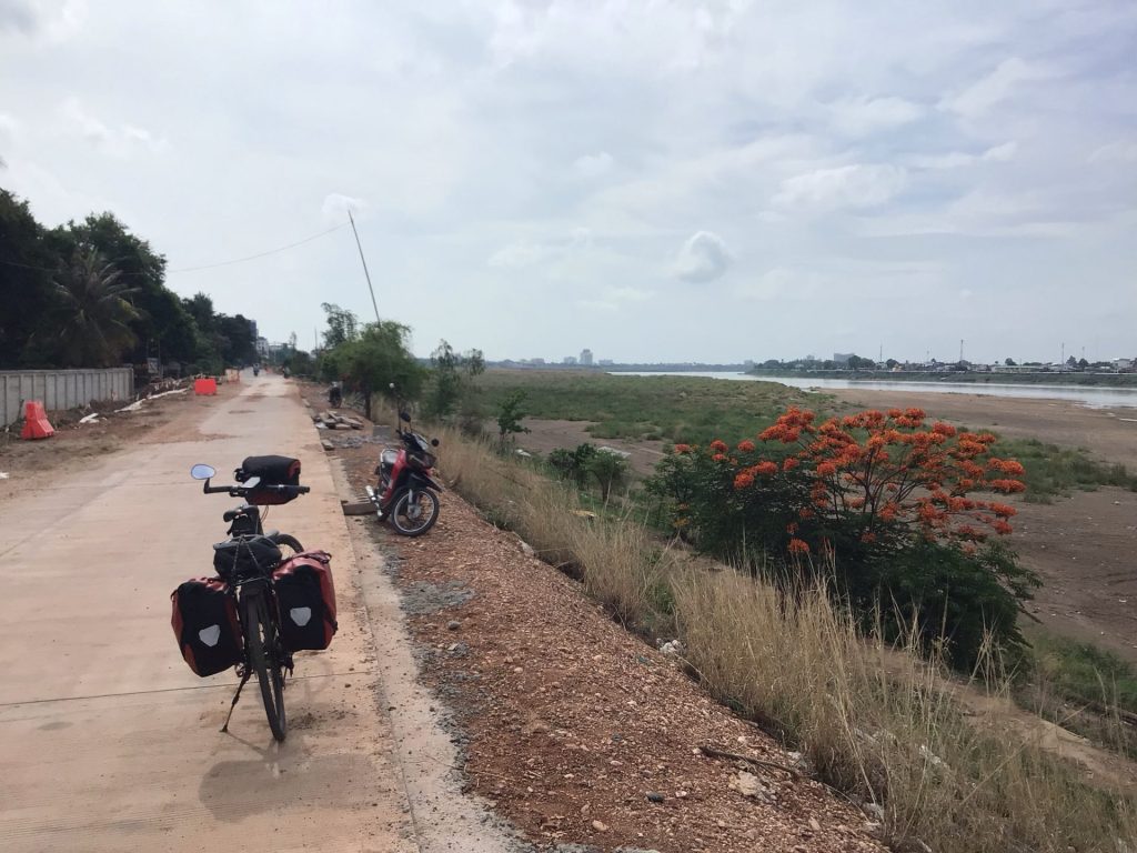 Je repars sous un beau ciel bleu. « Après la pluie, le beau-temps ! » comme dit l’expression populaire. La capitale se trouve à une quarantaine de kms à l’est en suivant toujours les rives du Mékong. Pour une fois, je pars avec le soleil dans les yeux. Après quelques kilomètres à l’intérieur des terres, je rejoins le fleuve. Les cailloux affleurants ont pratiquement disparu.