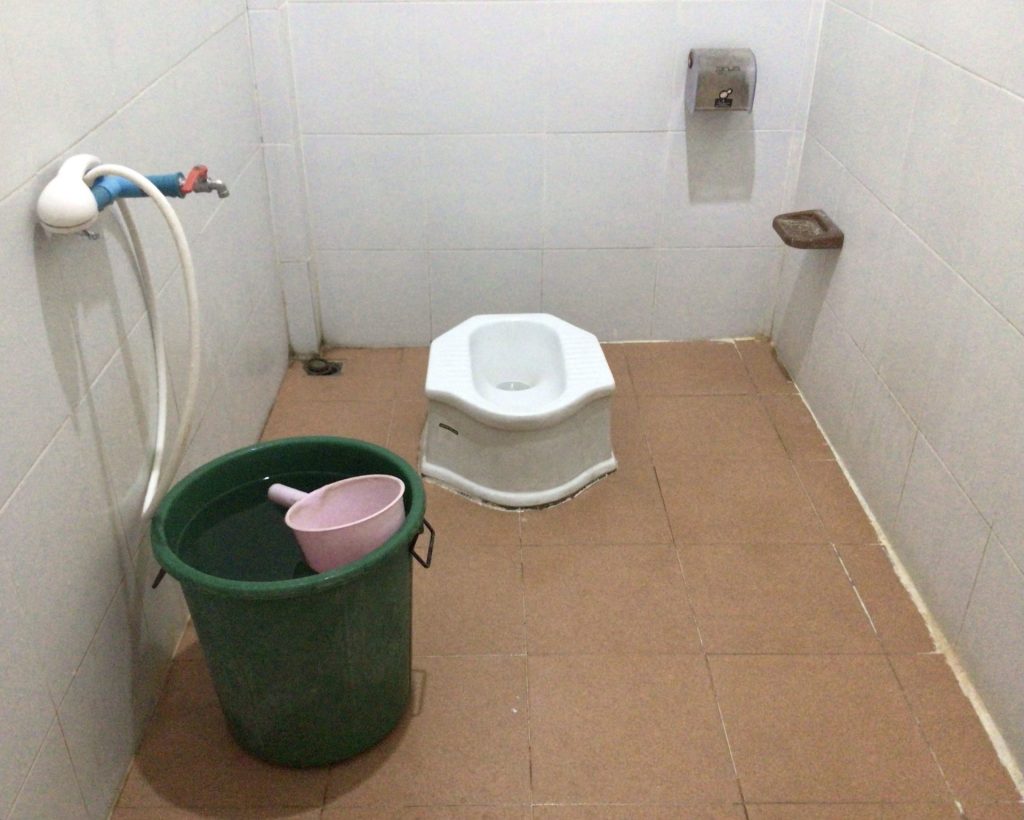 A ce propos, je vous présente ma salle de bain pour le moins rudimentaire : pas d’évier, pas de tuyau lave-fesse, pas de chasse d’eau. Mais, dans celle-ci, j’avais un tuyau de douche.