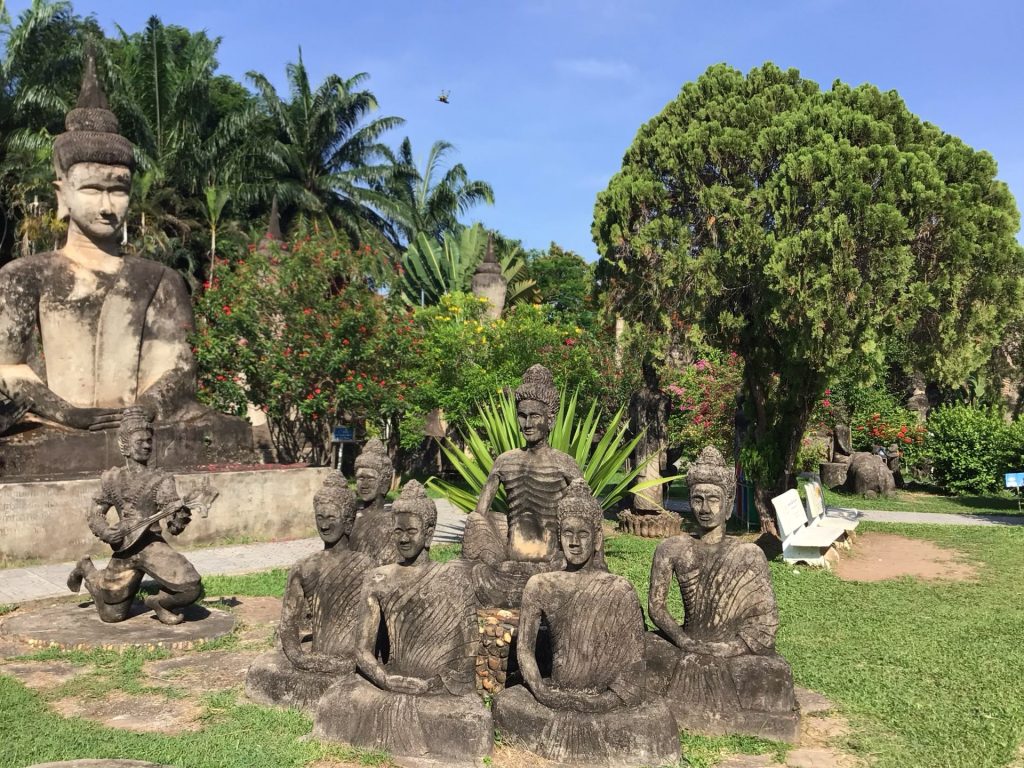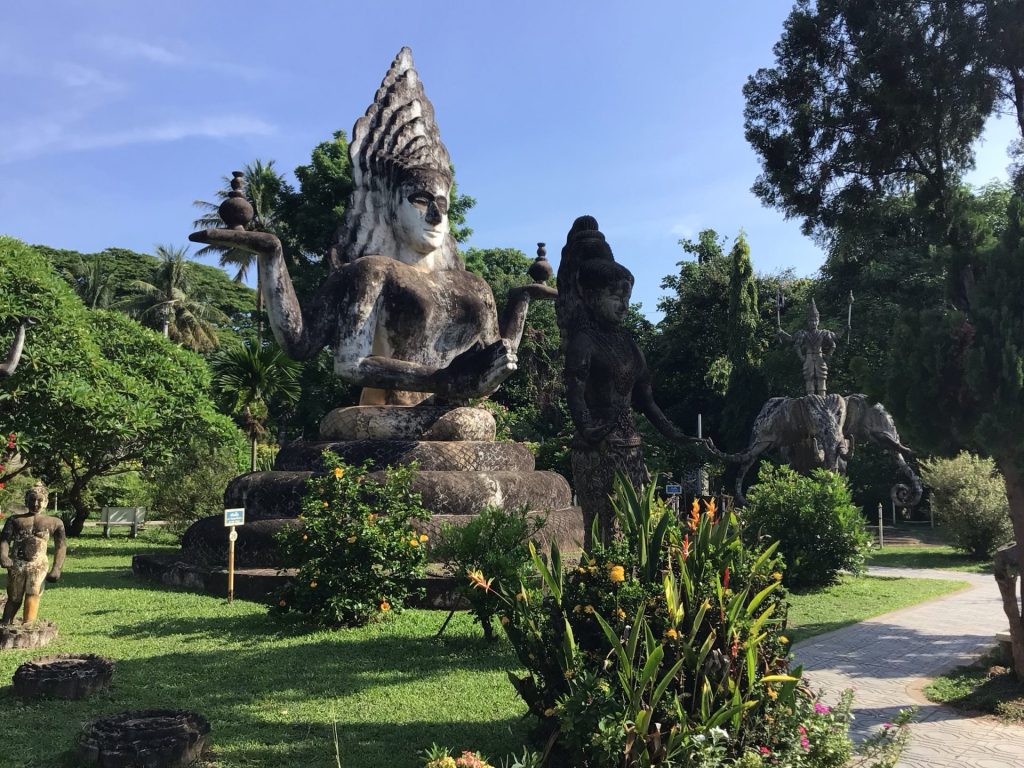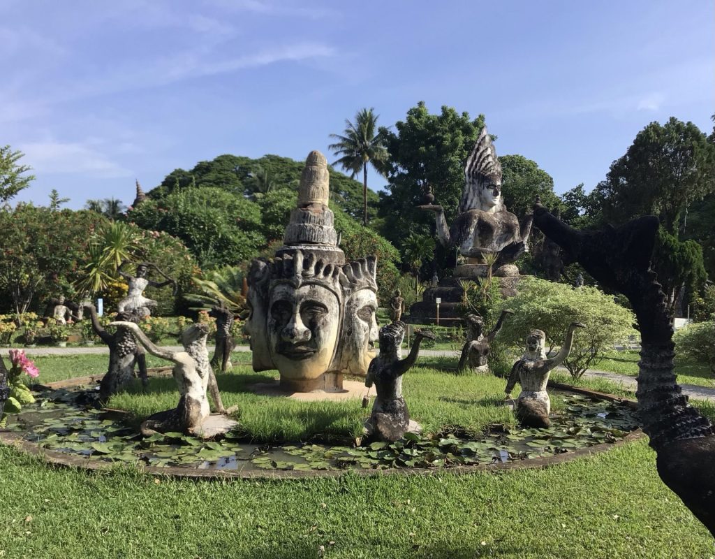 Après une vingtaine de bornes sur de mauvaises pistes trempées ou sablonneuses, j’arrive à l’entrée de ce parc construit en 1958. Les habitants l’appellent Xieng Khuan, qui signifie “ville spirituelle”. Ce Parc du Bouddha contient plus de 200 statues, parfois menaçantes, représentant des traditions bouddhistes et hindoues. Un Bouddha couché de près de 120 mètres de long est le joyau de la couronne de la collection.
