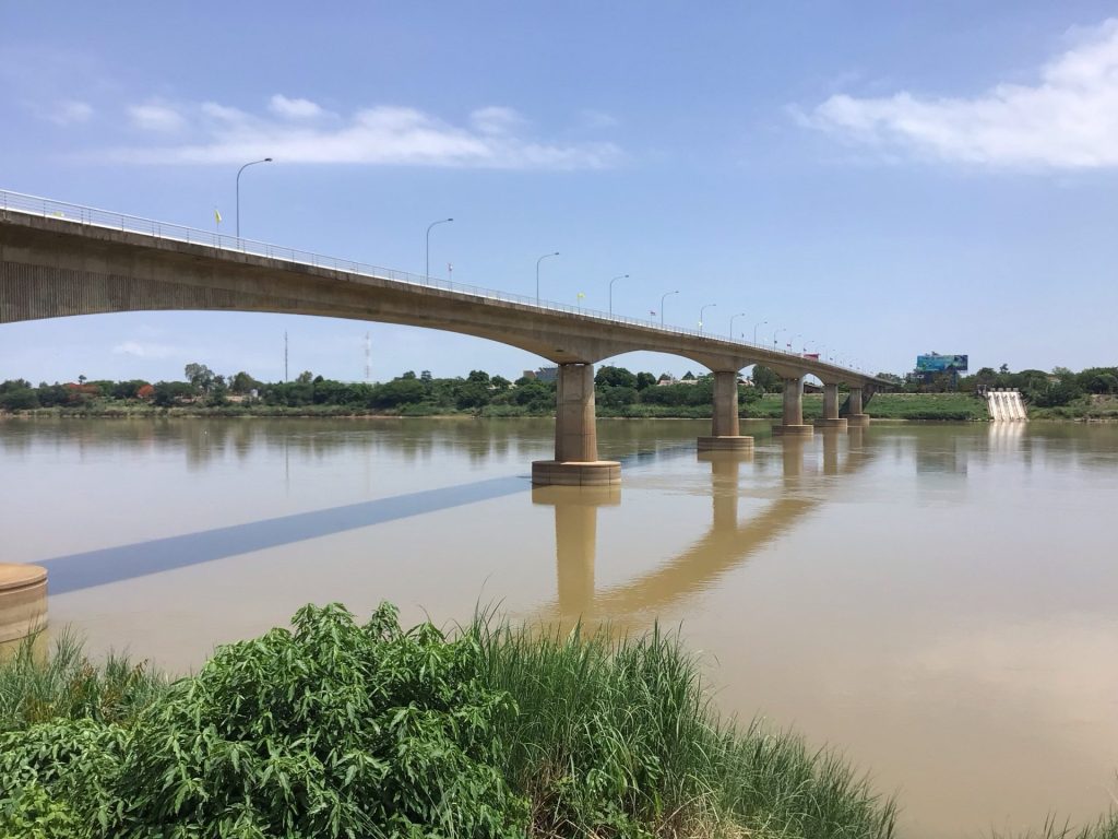 J’emprunte ensuite le Pont de l’Amitié qui relie ces 2 pays. Au départ des drapeaux laotiens flottent au vent. Passé la moitié du pont, ceux-ci font place aux drapeaux thaïlandais.