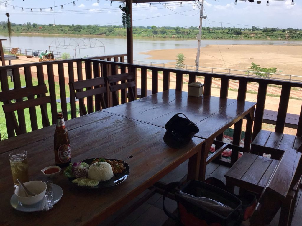 Mais, vu l’heure avancée, la chaleur de plus en plus écrasante, l’envie pas forcément présente de trop forcer, je décide d’écourter cette étape et de me poser dans le premier hébergement trouvé le long du fleuve. Peu avant midi, je traverse le village de Wiang Khuk en longeant toujours le fleuve mais sur une dalle de béton. Au-dessus de moi, j’aperçois des terrasses de restaurant avec des personnes attablées. Le cadre est superbe. Je m’arrête. Je fête mon retour au pays en me sifflant une bière Léo de 600cl, seul calibre de la maison.