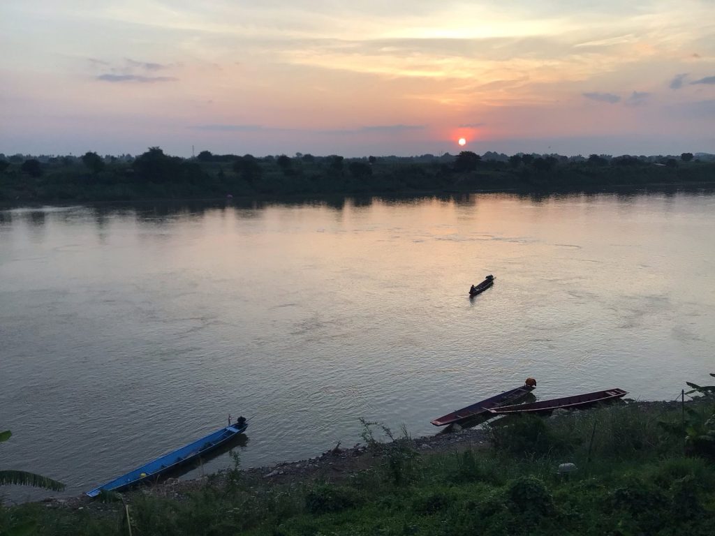 Dommage que ce GuestHouse se trouve en bordure de route. Sinon, c’eût été parfait. Je me réveille vers 5h du mat’. Lorsque je m’apprête à reprendre la route, j’ai la surprise de découvrir quelques gâteaux et des sachets de café à disposition devant ma porte. Je m’installe à une table devant le Mékong et le lever de soleil. Petit-déjeuner royal.