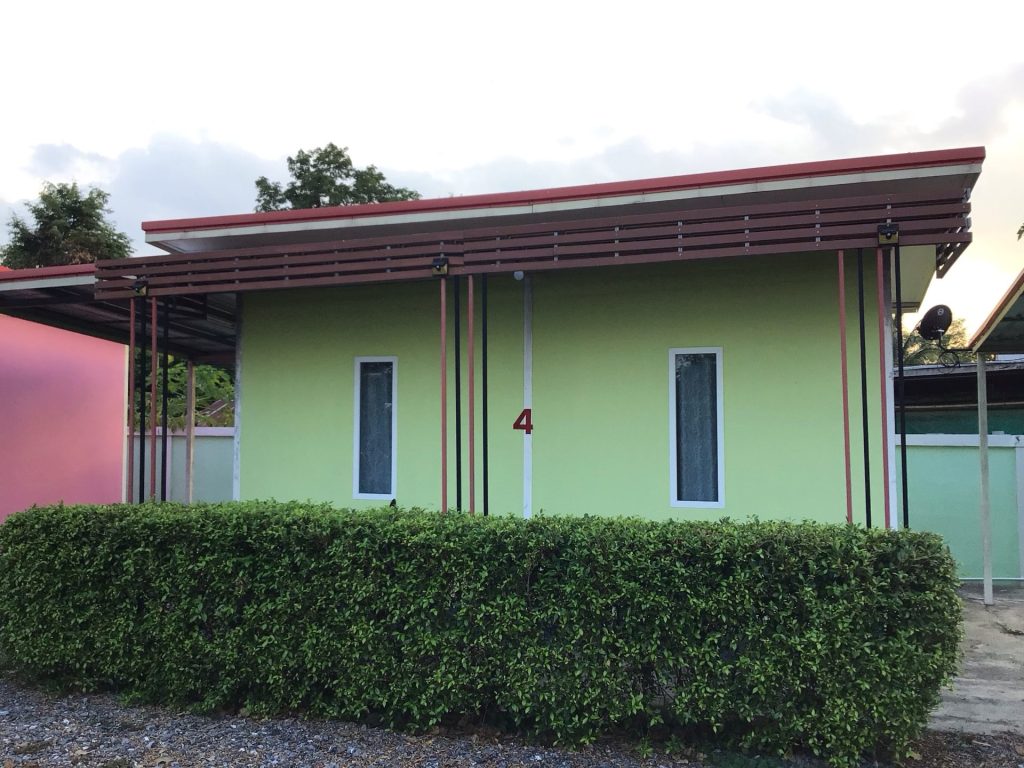J’en profite pour consulter mes cartes et repérer les rares hébergements du coin. Il est 11h00 lorsque je repars. Je suis déjà presque arrivé. Quelques kilomètres plus loin, j’entre dans le village de Ban Khok Muang après être passé devant un premier GuestHouse non répertorié sur ma carte. Je fais le tour du village mais ne trouve pas celui repéré. Le suivant devait se trouver à un peu moins de 10 bornes. Le cagnard tape. Le thermomètre du site de météo indique 35°c à l’ombre. Je rebrousse chemin et me renseigne pour louer un des petits bungalows. Le prix est de 400THB (11€). Parfait. Je me pose. Je suis à un petit kilomètre du village. Vers midi, je m’y rends à vélo pour déjeuner du traditionnel riz/poulet accompagné d’une Chang bien fraîche. Il est l’heure de la sieste et du farniente au frais dans ma petite maison jaune.