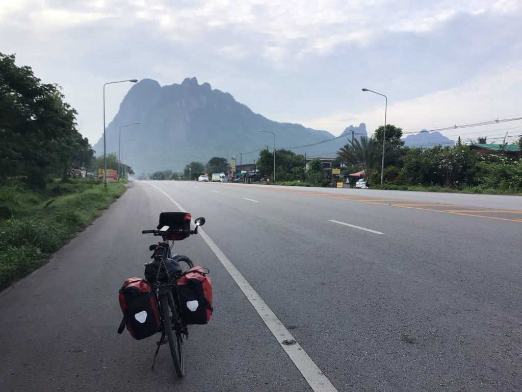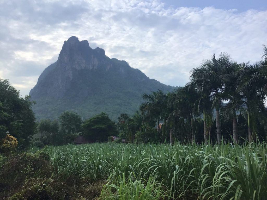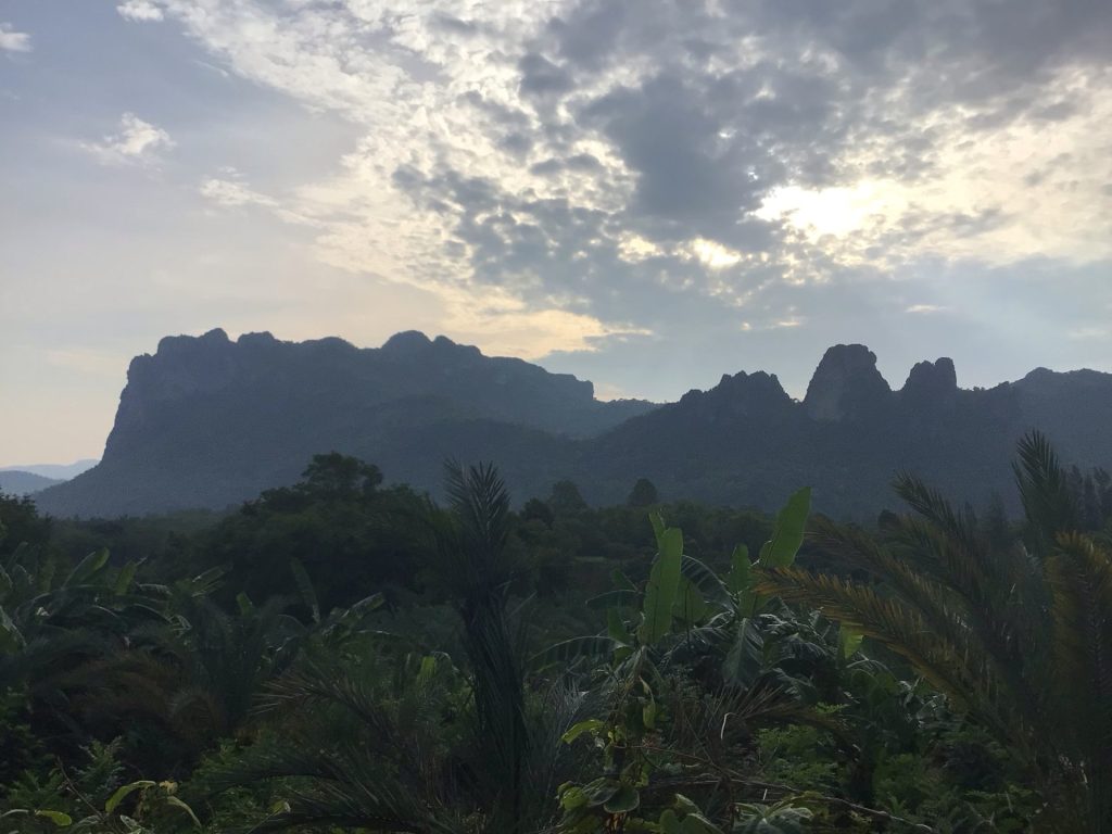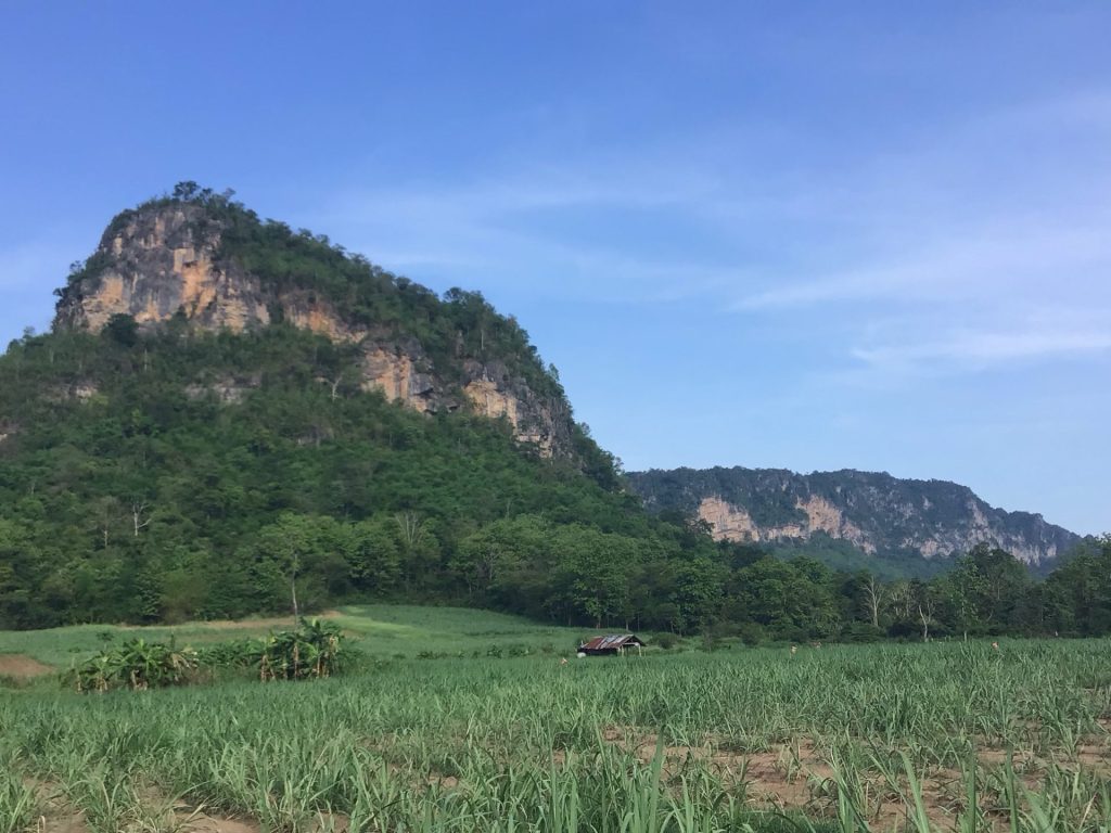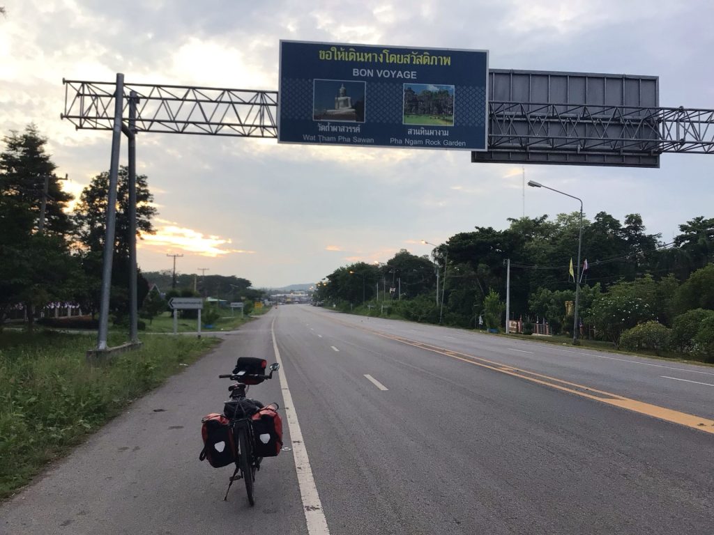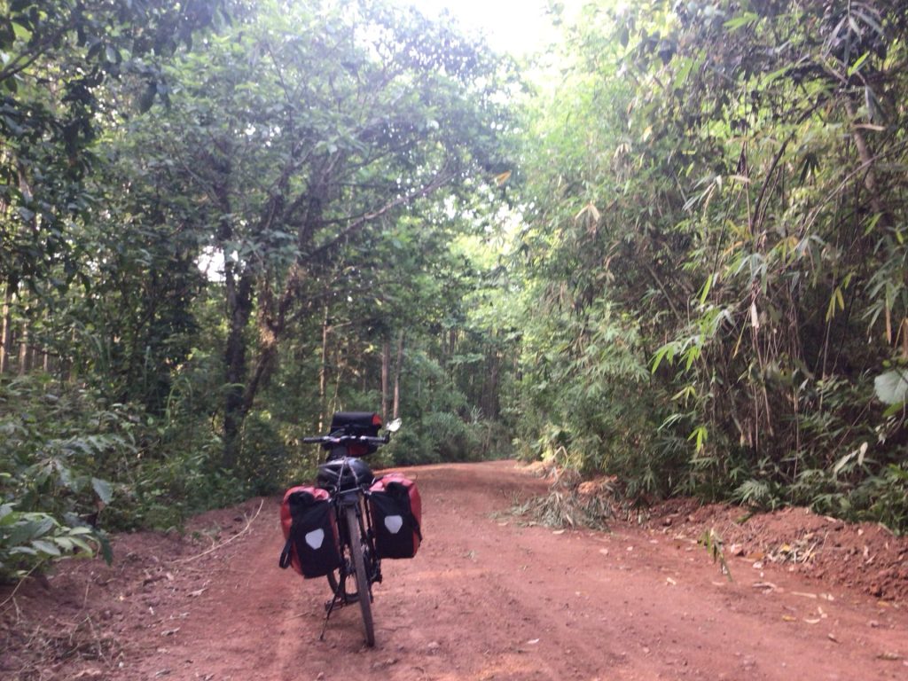 Alors que, sur ma gauche, ce sont ceux du Phu Pha Man National Park qui se dresse majestueusement dans le soleil levant. Quel pied ! Même si la montée est abrupte, je me régale de ce spectacle matinal. Je préfère en baver un peu plutôt que de rouler sur une route toute plate. D’ailleurs, c’est qui m’attend après … Par contre, ma petite route bétonnée fait rapidement place à une piste dès que la pente s’adoucit.