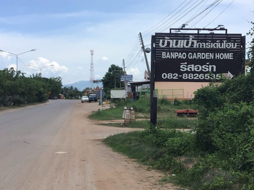 La chaleur redevient suffocante, la route rectiligne, la circulation dense, le plaisir nul. Heureusement, le vent me pousse au cul. J’avance à un bon rythme. Vers 10h30, je m’arrête boire un café glacé. Mais, même là, le plaisir n’y est plus. Le café n’est pas terrible en plus d’être cher. L’endroit n’invite même pas à gâcher de la pellicule. J’en profite pour refaire le plein d’eau. Je repars avec Led Zepp pour me refiler un peu la patate. J’ai prévu d’aller jusqu’à la ville de Kaset Sombun où j’ai repéré des hébergements. La route défile. Les kilomètres aussi mais pas assez vite à mon goût. Pourtant, ce n’est pas faute d’appuyer sur les pédales. De plus, la chaleur devient vraiment insupportable. Midi approche. Je suis encore à une douzaine de bornes. Encore une toute petite heure sous le cagnard. J’entre maintenant dans la bourgade de Ban Pao. Je m’arrête au marché pour acheter des mangues. A tout hasard, je demande en mimant s’il y aurait un endroit où dormir. La marchande tend le bras en m’indiquant une direction au loin à l’asiatique. Je m’y dirige. Quel bonheur quand je découvre ce panneau …