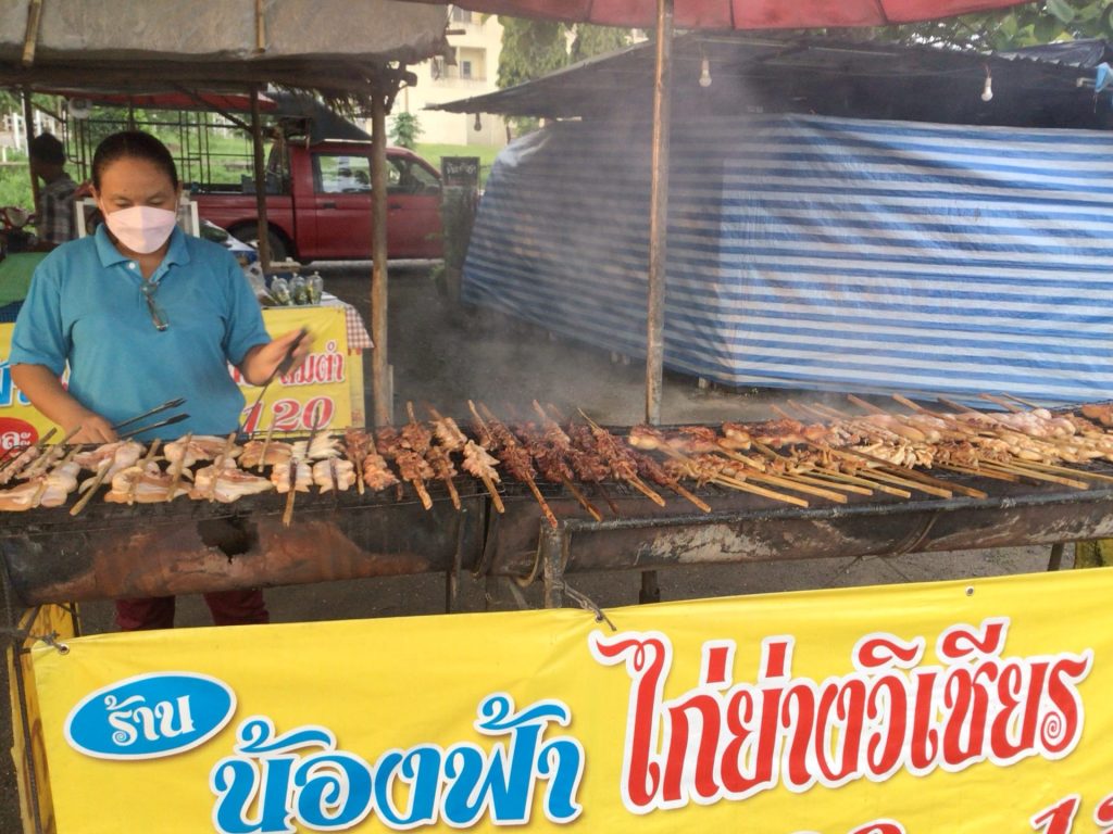 Sur l’artère principale, quelques marchandes ambulantes sont déjà à pied d’œuvre. Je me rapproche de celle dont les grillades sont presque prêtes. Elle me fait quand même patienter pour que ma grillade soit parfaite. J’achète aussi mon pochon de riz et pars déjeuner sous la statue de la joueuse de flûte.