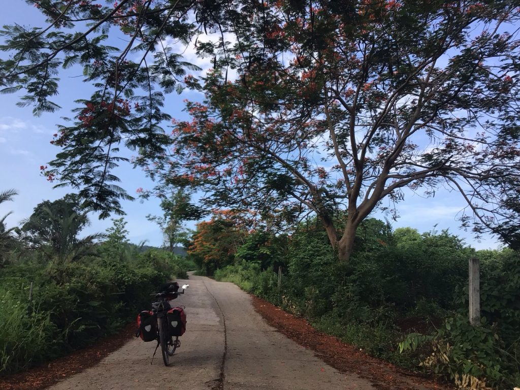 … et, comme prévu, j’attaque la montée par une charmante route bétonnée. Ça grimpe sec. Je suis tout à gauche dans des pentes à plus de 8%. Mais le paysage est de toute beauté, la végétation luxuriante. Au loin, j’aperçois sur ma droite les monts du Phu Kradueng National Park.