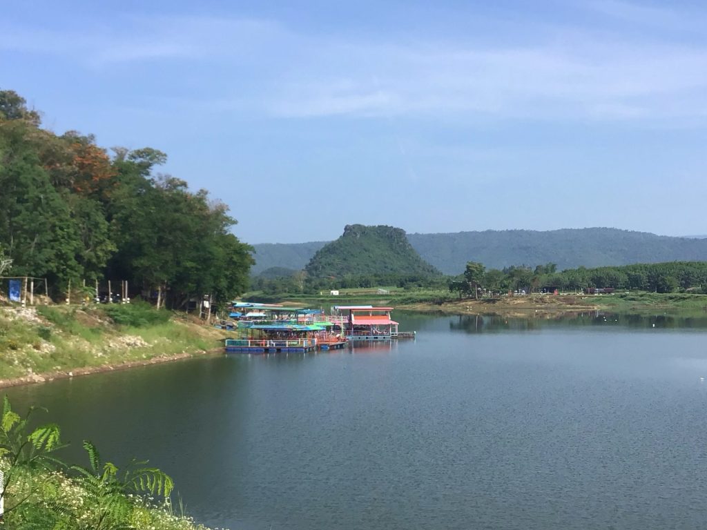 J’emprunte maintenant de petites routes à travers la campagne avant de rejoindre des axes plus fréquentés. Après avoir traversé le village de Huai Muang sans avoir trouvé un café ouvert, je tombe sur un panneau qui m’indique justement un « Coffee ». Je le suis et arrive devant le réservoir éponyme. Une sorte de complexe touristique est construit le long de ce grand plan d’eau artificiel. Un kiosque m’invite à prendre ma dose matinale. La gérante parle d’ailleurs un petit peu anglais. Cela tombe bien, moi aussi. Nous échangeons quelques banalités alors que je déguste son délicieux café noir et chaud.