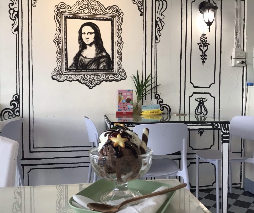 En milieu d’après-midi, je sors de mon igloo pour aller manger une glace dans un endroit repéré en cherchant mon hébergement. Je découvre un endroit assez improbable tenu par une jeune et charmante thaïlandaise parlant anglais. Elle m’avait vu passer sur mon vélo en fin de matinée et est très contente de pouvoir me questionner sur mon parcours. Quant à moi, je me régale d’une glace chocolat-noix de coco sous le regard amusé de La Joconde. Encore une belle rencontre (pas La Joconde !).
