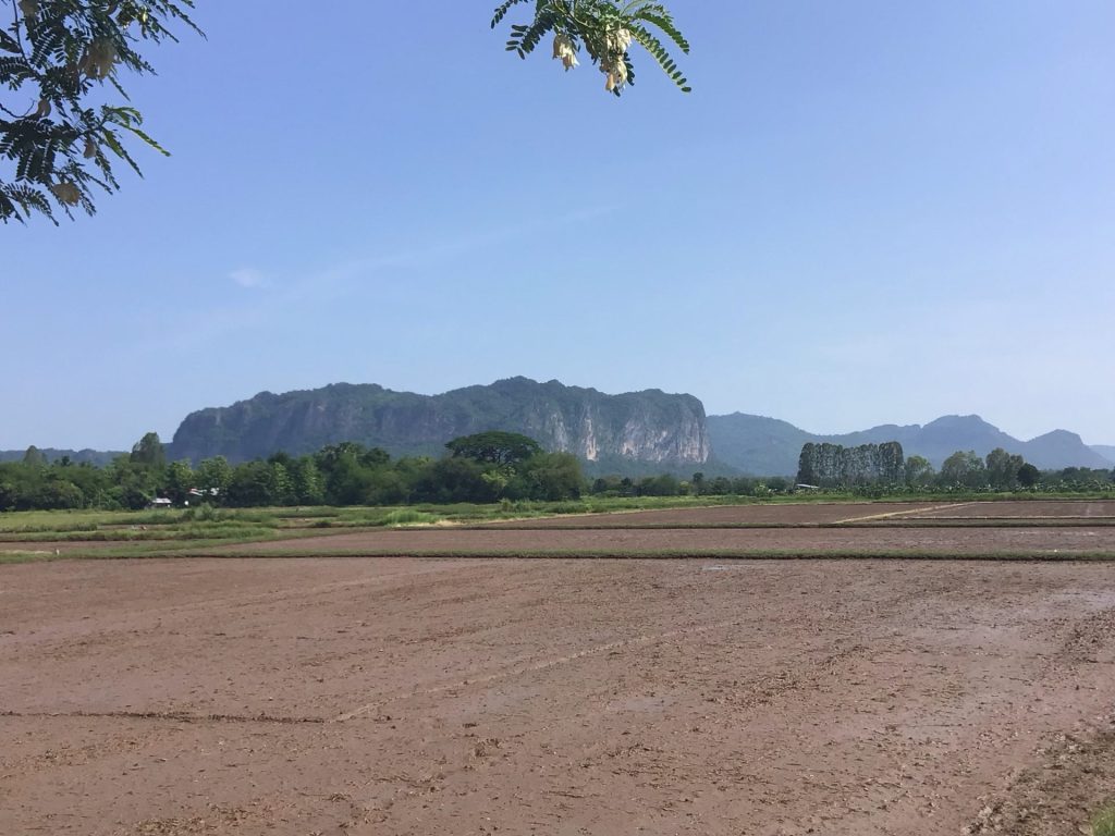 Il est un peu plus de 8h30. Il me reste encore quelques kilomètres à parcourir avant d’arriver à la grosse bourgade de Ban Namphu Pang Wua, carrefour entre la route nationale n°12 (et Asia Highway n°16 qui relie Mae Sot le long de la frontière birmane à l’ouest à Mukdahan sur le Mékong au bord de la frontière cambodgienne de Savannakhet à l’est) et la route 2159 qui me mène au sud. Après ces 50 premiers kilomètres de bonheur à l’état brut, j’attaque la partie la moins intéressante. Je retrouve la plaine et ses rizières préparées pour accueillir une nouvelle récolte après la saison des pluies qui arrive. Je laisse au loin ce parc sauvage.