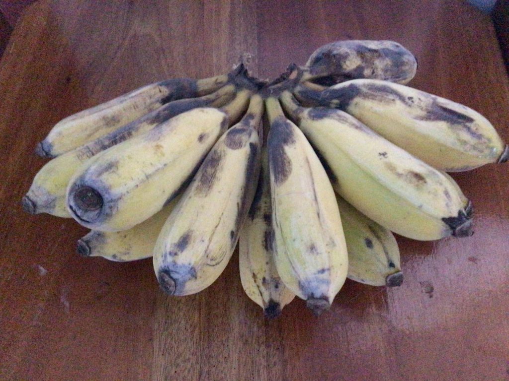 Je me douche et lave mes fringues couvertes de poussière. Puis je pars déjeuner dans la première gargote venue, trouvée au plus près de ce HomeStay (que je nomme Season vu l’orthographe thaï). Le déjeuner riz-légumes-porc épicé, la bonne bière Chang bien fraîche et la chaleur accablante m’incitent à rentrer dare-dare me coucher avant que je ne m’écroule. Il est 13h00. Le plus dur est fait. Avant de rentrer, j’ai acheté un régime de bananes. Le prix est de 25THB. Même si elles sont bien mûres, ce n’est vraiment pas cher. Je comprends pourquoi les bananiers sont remplacés par d’autres plantations plus lucratives.