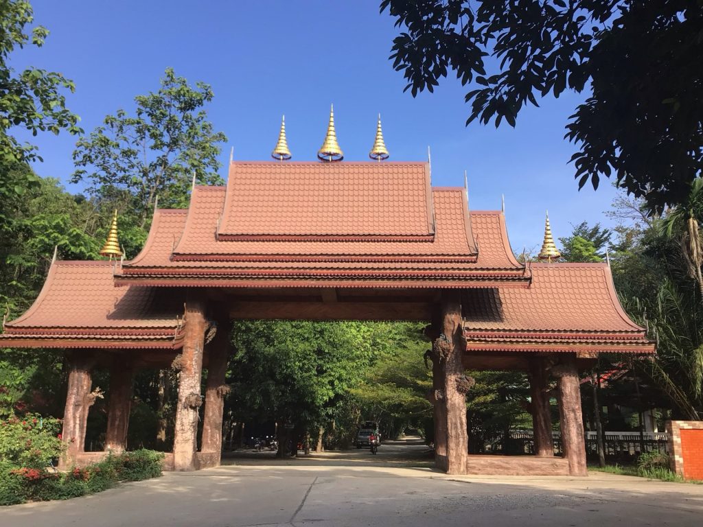J’entre à présent dans le village de Ban Sam Phaknam. A l’entrée de cette petite bourgade, un portail immense annonce la présence d’un temple. Je m’y engage. Las ! Le temple est beaucoup moins impressionnant que son imposante porte.