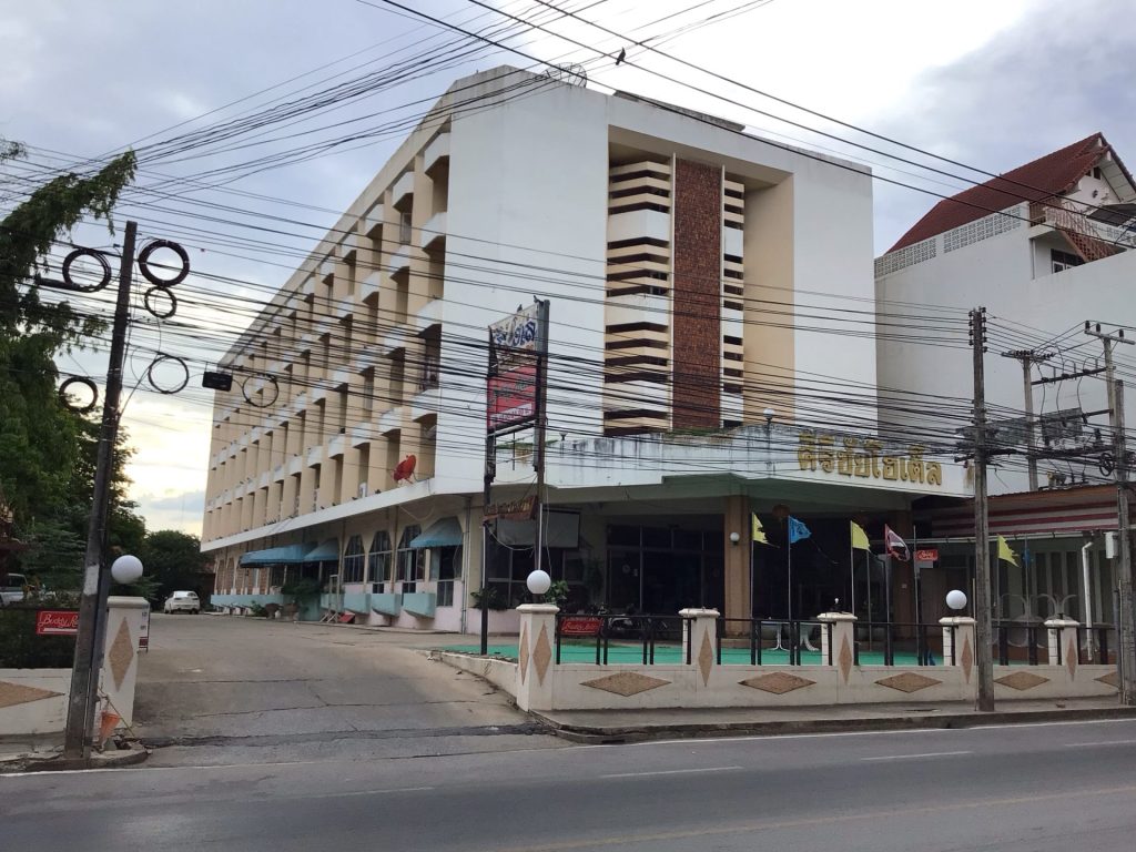 Je retrouve Haka2 qui m’attend sagement. Vers 11h00, nous repartons pour terminer cette descente et attaquer une longe ligne droite vallonnée d’une vingtaine de kms qui nous mène à la ville de Chaiyaphum, terme de cette étape. A midi, j’entre en ville. Je me dirige vers un des hôtels repérés sur ma carte. Évidemment, je ne le trouve pas ou il a disparu depuis. Je me renseigne et en dégote un autre un peu plus loin. Il n’y aucun panneau en anglais. Mais vu la forme austère du bâtiment, je me dirige vers le hall pour confirmer que je suis bien ans un grand hôtel sans charme.