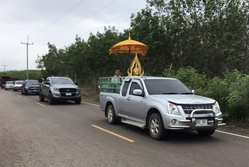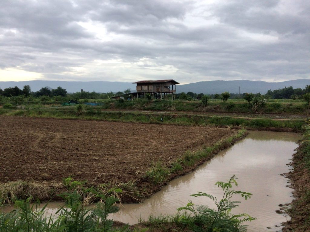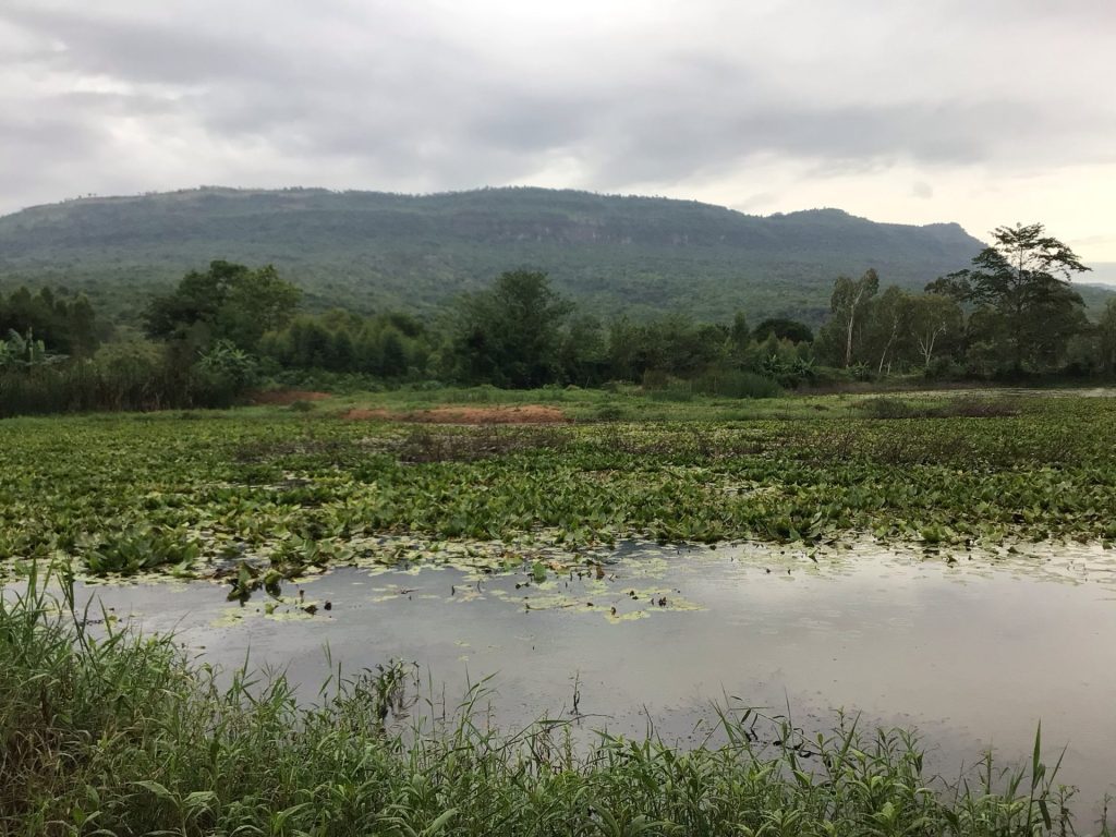 Le ciel est couvert en ce lundi matin. Heureusement qu’il ne pleuvait pas sinon je serais resté au lit. Je me réserve un joker en cas d’intempérie matinale. En attendant, je retrouve la route n°2159 que j’aurais dû emprunter hier jusqu’à Kaset Sombun. D’ailleurs, j’y passe alors que la ville s’éveille tranquillement sous ce ciel menaçant. Sur ma droite, les nuages s’amoncellent sur les sommets du Nam Nao National Park. A part la route principale n°12, aucune petite route ne traverse ce grand parc. Je ne l’emprunterai donc pas.