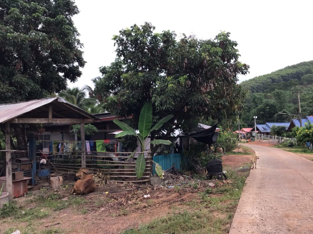 C’est encore plus impressionnant avec le mauvais temps. D’ailleurs, une pluie fine commence à tomber. J’espère que cela ne va pas empirer alors que je ne vais pas tarder à attaquer la grimpette. Mais avant cela, je traverse le village de Ban Nam Hae. Dans les ruelles, un marchand ambulant klaxonne pour attirer la clientèle et tenter de fourguer ses sachets suspendus à son side-car.