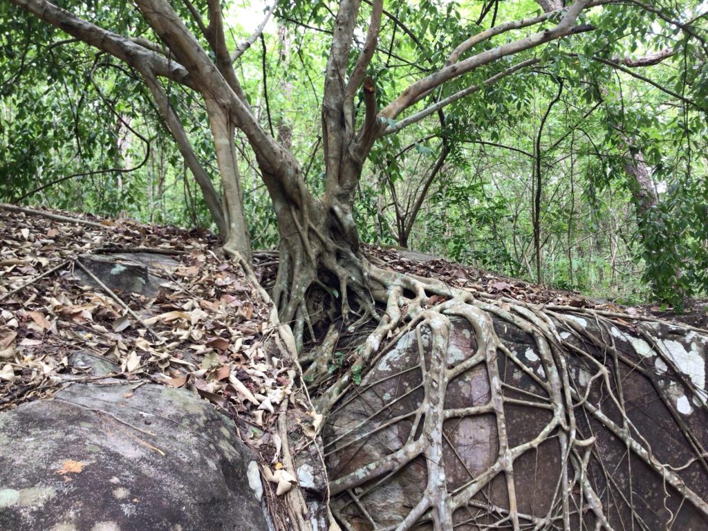 Peu de temps après, j’attaque la descente pour basculer de l’autre côté de ce parc national. Alors que j’arrive presque en bas, de grands panneaux annoncent l’entrée des Tat Ton Waterfall. Comme l’étape est courte et que j’ai déjà bien roulé, je bifurque à gauche pour m’y rendre. Après m’être acquitté de 200THB (5€) pour l’entrée des étrangers, je pose mon vélo et me dirige vers le coin restaurant. Ils sont 5 ou 6 aligné dans la pente à se faire concurrence … de personne. Je vais à celui le plus bas. A défaut de vrai café, je me prends une cannette de café et m’installe à la table de la patronne. Elle est en train de trier des cacahuètes qu’elle me fait goûter en plus d’une papaye. J’essaie d’échanger via mon traducteur mais elle bloque lorsque je lui demande de parler dans le micro. Tant pis.
